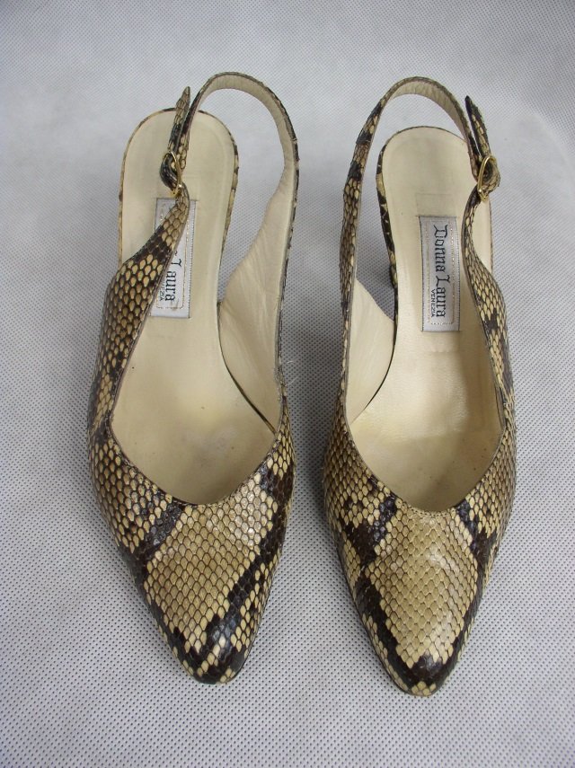 Włoskie buty na obcasie firmy Donna Laura VENEZIA.Uszyte z naturalnej skóry węża.Podszewka i wkładka ze skóry naturalnej.Spód ze skóry naturalnej.Obcas podbity czarną gumą.Prosty kształt z paseczkiem zapinanym na kostce.Stan bardzo dobry-spód lekko starty.Rozmiar 37,długość wkładki od czubka 25 cm.wysokość obcasa 7,5 cm.