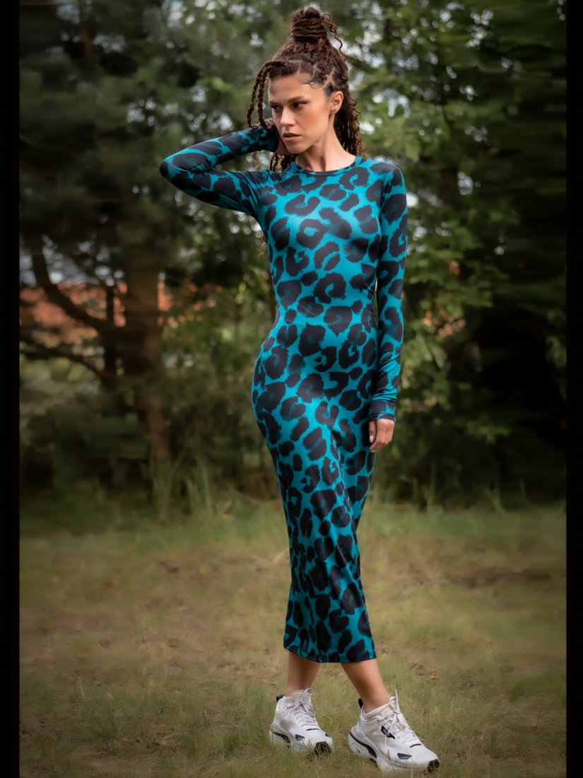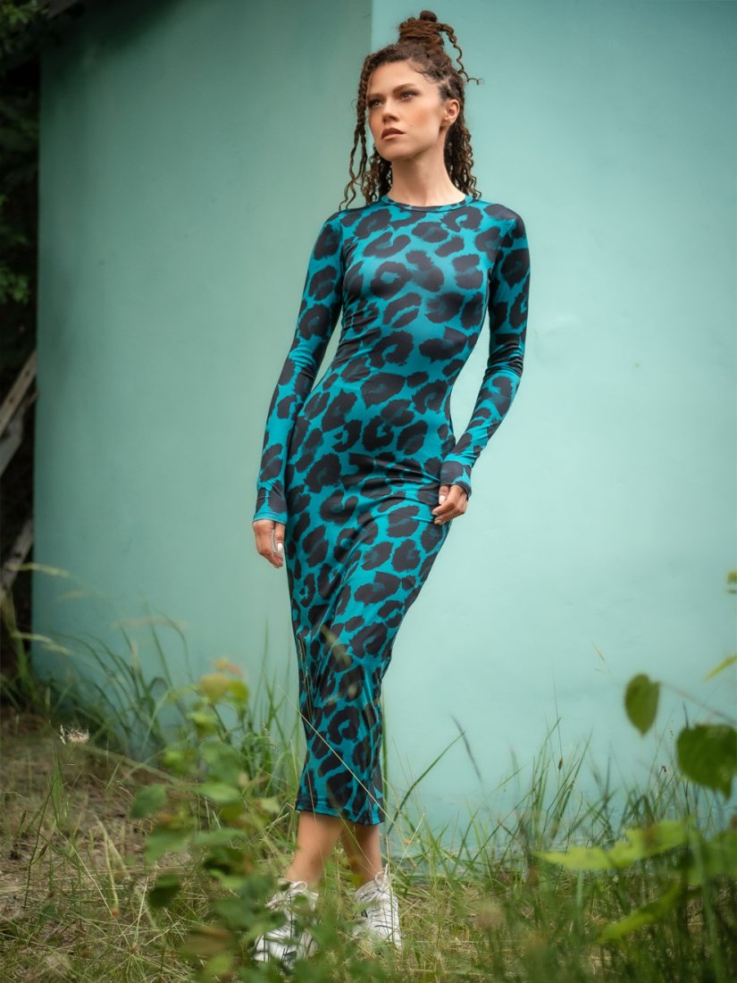 Zanurz się w energetyczny turkus z dzikim akcentem. Ta dopasowana sukienka o długości 7/8 to połączenie zmysłowej sylwetki i autorskiego printu.