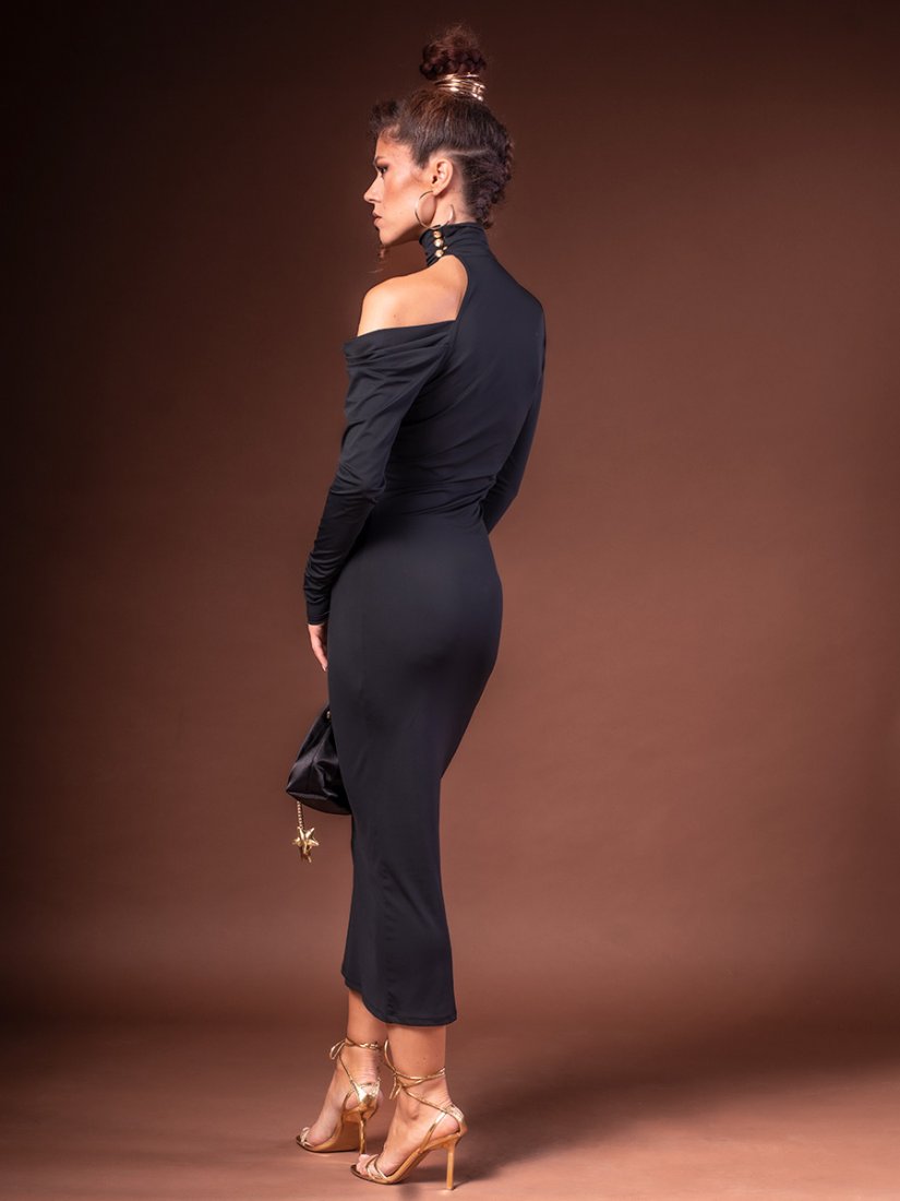 Dopasowana, o długości 7/8. Idealnie podkreśla sylwetkę. Górę kreacji skonstruowałam asymetrycznie, udrapowałam jeden z rękawów i odsłoniłam ramię. Całość wykończona jest dobrze przylegającym golfem z ręcznie przyszytymi ozdobnymi, złotymi guzikami.