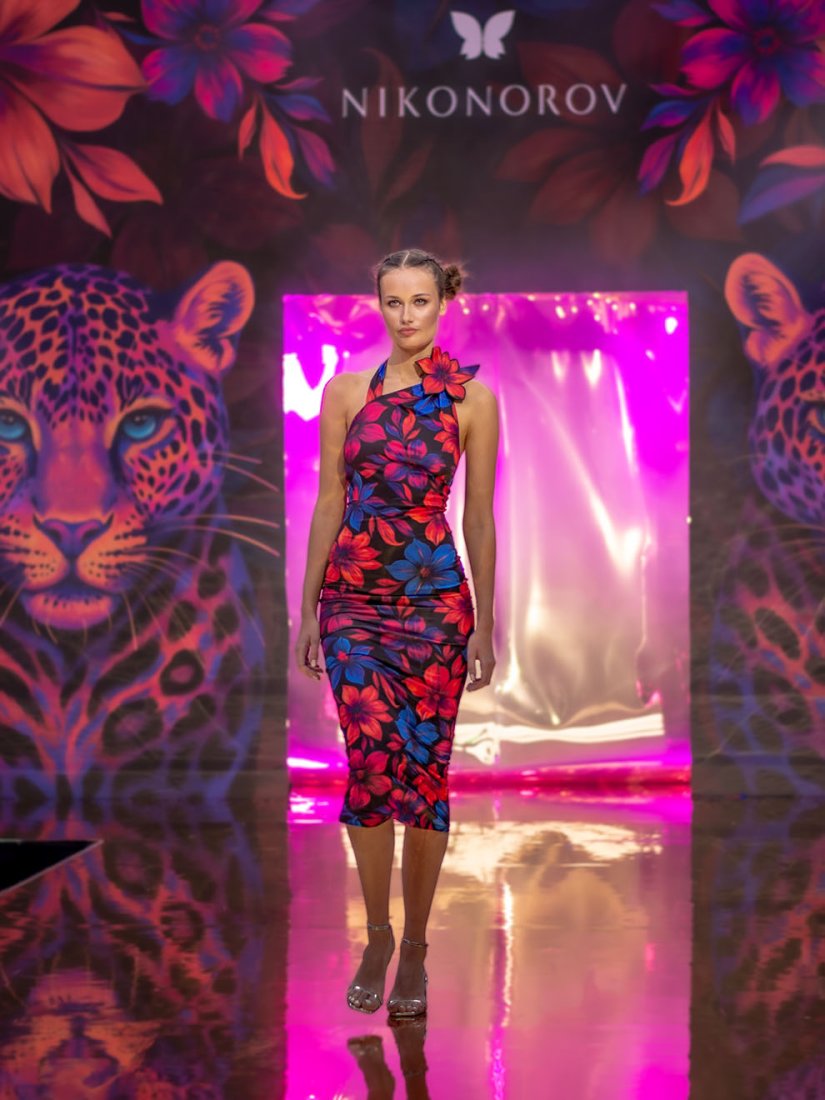 "Iris" to sukienka, która przyciąga uwagę już od pierwszego spojrzenia. Jej dopasowany krój podkreśla sylwetkę, a asymetryczna góra z wiązaniem na szyi dodaje nowoczesnego charakteru. Ręcznie wykonany kwiat z tego samego materiału stanowi oryginalną ozdobę – aby zachować kształt, został usztywniony.
