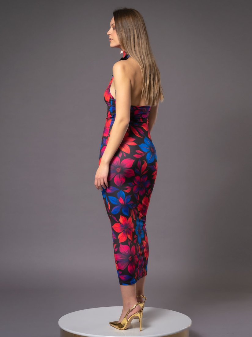 "Iris" to sukienka, która przyciąga uwagę już od pierwszego spojrzenia. Jej dopasowany krój podkreśla sylwetkę, a asymetryczna góra z wiązaniem na szyi dodaje nowoczesnego charakteru. Ręcznie wykonany kwiat z tego samego materiału stanowi oryginalną ozdobę – aby zachować kształt, został usztywniony.