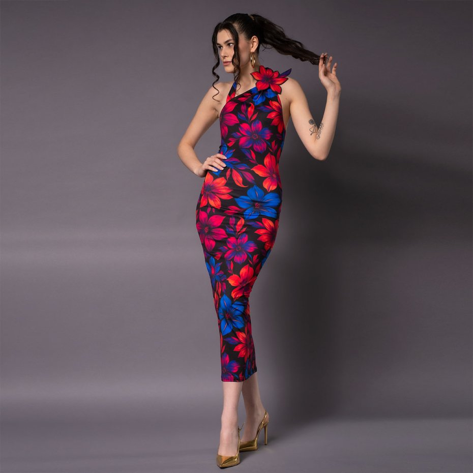 "Iris" to sukienka, która przyciąga uwagę już od pierwszego spojrzenia. Jej dopasowany krój podkreśla sylwetkę, a asymetryczna góra z wiązaniem na szyi dodaje nowoczesnego charakteru. Ręcznie wykonany kwiat z tego samego materiału stanowi oryginalną ozdobę – aby zachować kształt, został usztywniony.