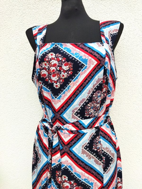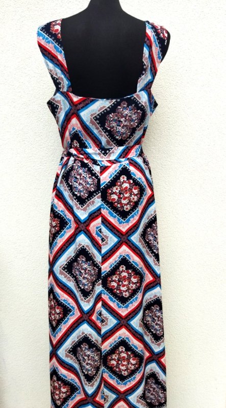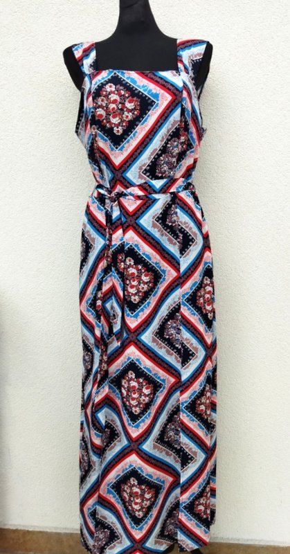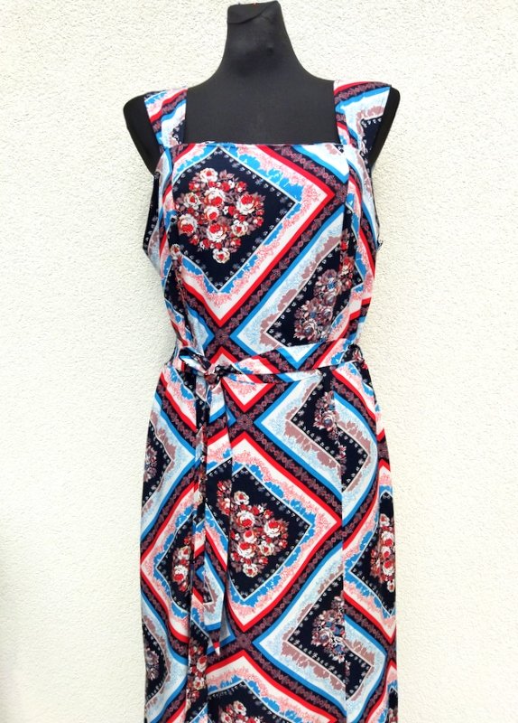 Sukienka maxi z wiskozowej tkaniny w patchworkowe kwiatowe wzory w kolorystyce bieli, czerwieni, błękitu, czerni i i indyjskiego różu. Odcinana w pasie góra dopasowana na szerszych szelkach, dół trapezowy lekko poszerzany do dołu z rozcięciami z przodu do wysokości kolan. Wiązana paskiem w talii.