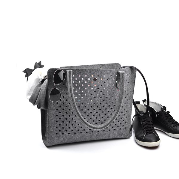 - wzór: kółeczka o średnicy 6 mm wycięte z obu stron torebki - są na tyle małe, że nie widać przez nie co dokładnie znajduje się w środku, ale jednocześnie dodają odrobiny koloru torebce przez znajdujące się w niej rzeczy