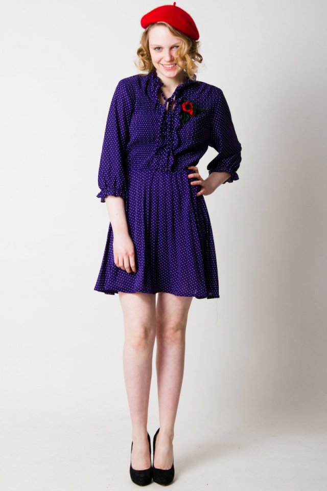Granatowa elastyczna sukienka w białe groszki. Rękaw zakończony falbanką i elastyczną gumką, w pasie również znajduje się gumka - dzięki niej sukienka idealnie dopasowuje się do sylwetki. Dół sukienki jest plisowany, na górze jest żabocik oraz wiązanie.