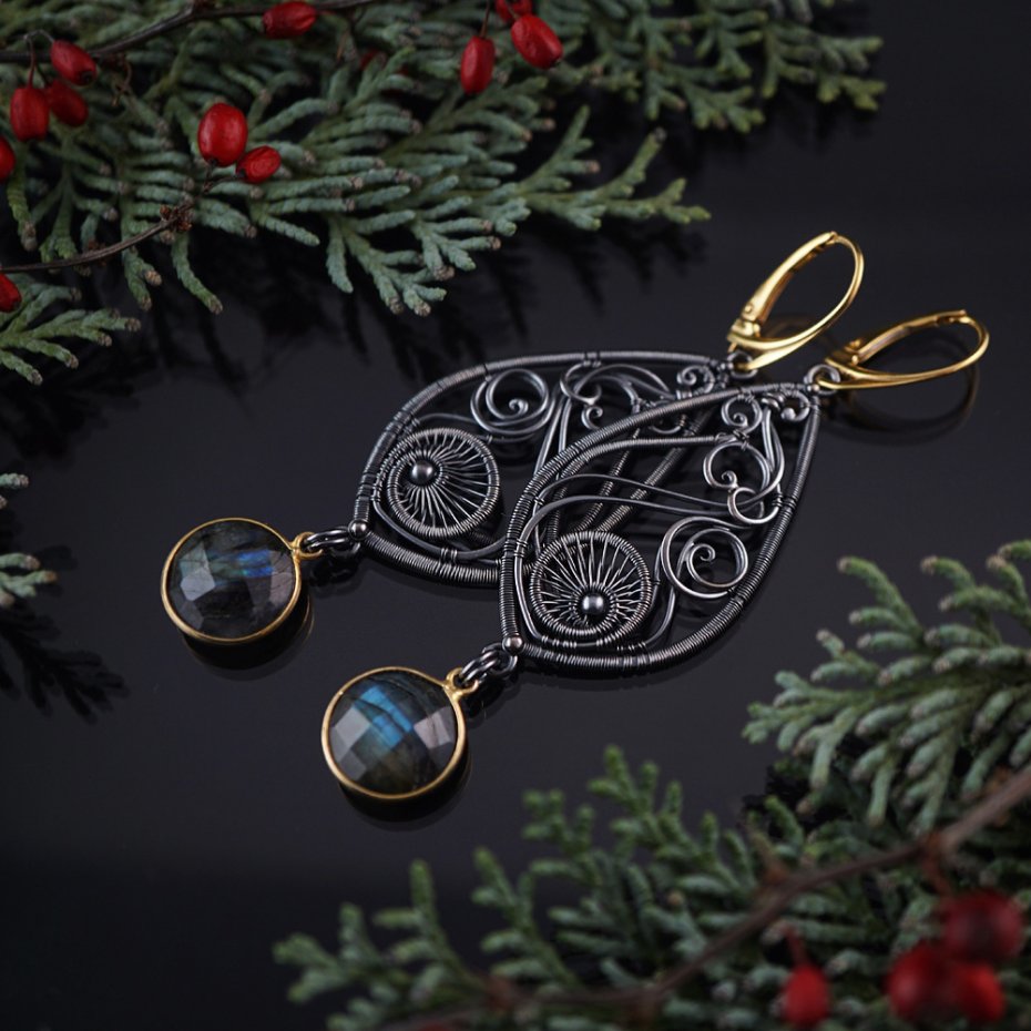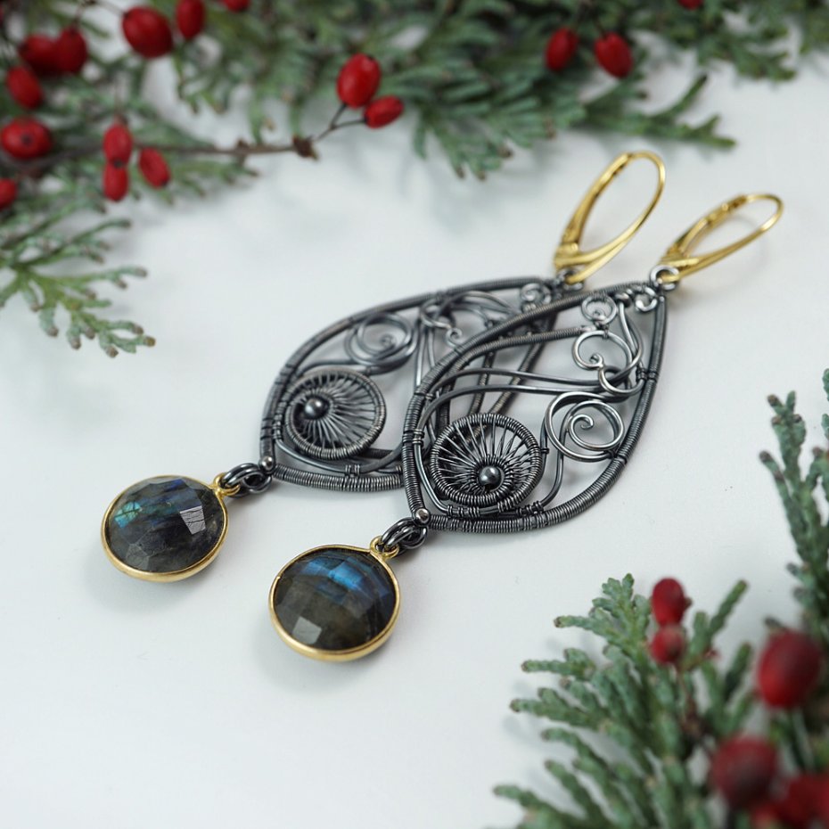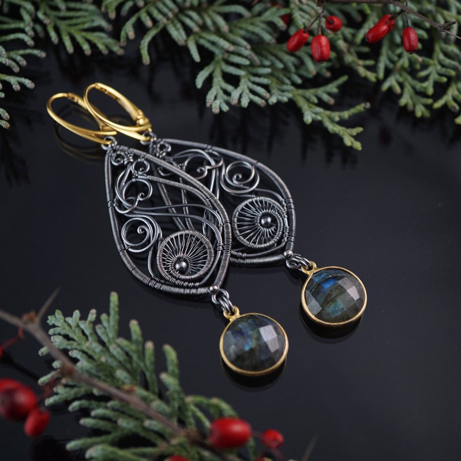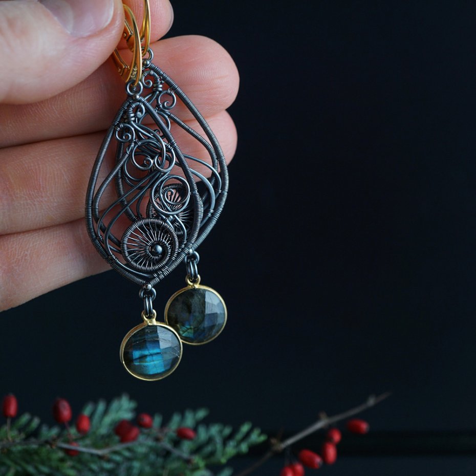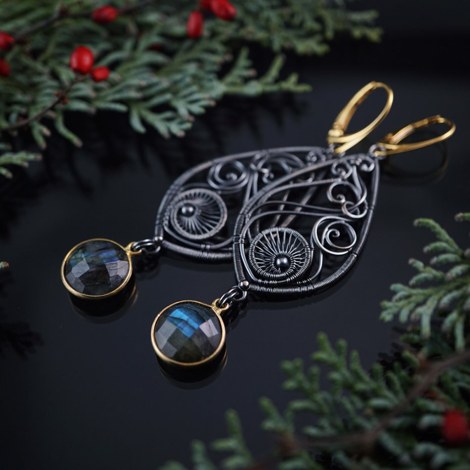 Kolczyki zaprojektowałam i wykonałam od podstaw, z przyciemnianego (oksydowanego) srebra próby 925, srebra pozłacanego oraz fasetowanych labradorytów. Całość zawieszona na wygodnych biglach angielskich.