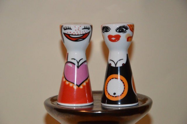 Dwa porcelanowe dowcipne przyprwniki na pieprz i sól ,wysokosc pojemniczków 8 cm