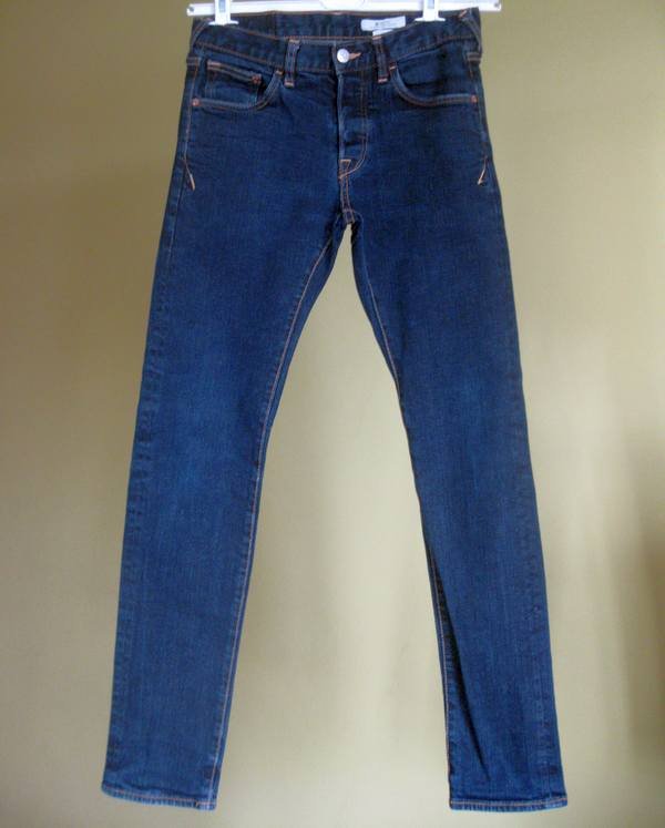 Wąskie spodnie jeansowe. Materiał 99% bawełna 1% lycra. Kolor ciemny granat. Rozmiar z metki 29/32. Zapięcie na napy. Stan bardzo dobry-.