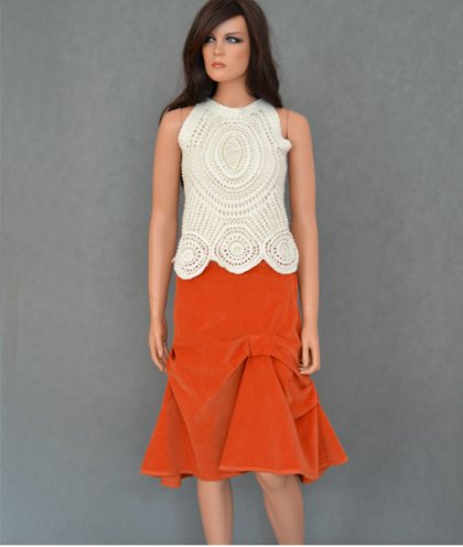 Bardzo ciekawa spódniczka z cienkiego sztruksu w rudo marchewkowym kolorze. Drapowana, rozszerzająca się. Zapinana z boku na zamek. Polecam.