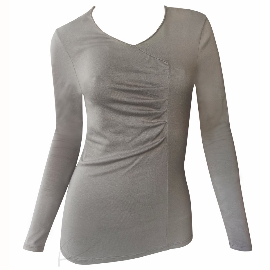 Projekt: top z asymetrycznym cięciem i drapowaniem z przodu. Długi, wąski rękaw.