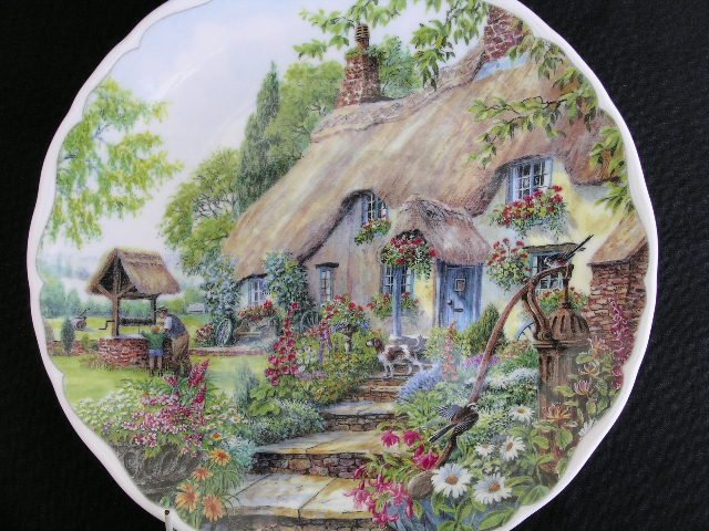 Malarsko dekoracyjny talerz porcelanowy, sygnowany jakością Royal Albert. Z kolekcjonerskiej serii Dream Cottages ze zdobieniem autorstwa Petera Riverforda, edycja z 1993 roku. Rant falbanowany, delikatnie ryflowany, biel porcelany i barwna, misterna malatura; błyszczące szkliwienie. 21,5 x 2 cm. Z tyłu zdejmowalny profesjonalny uchwyt do powieszenia. Stan zachowania bardzo dobry.