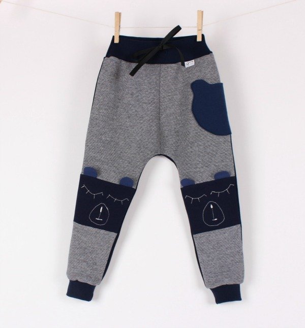 Spodnie z obniżonym krokiem (pumpy), kieszonka z boku w kształcie głowy misia z uszami.