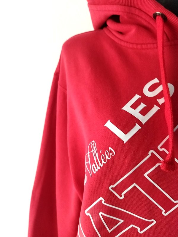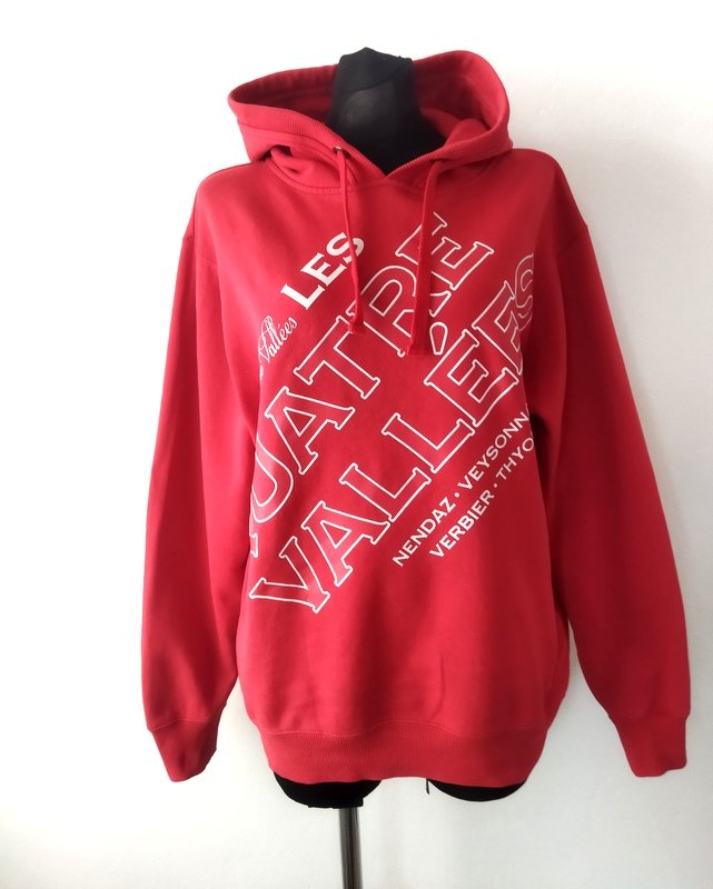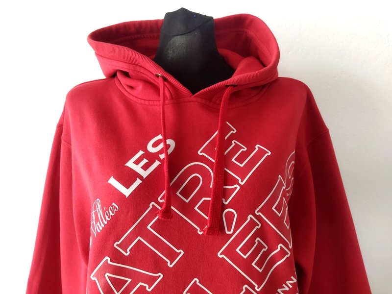 Bluza z bawełnianej tkaniny dresowej w czerwonym kolorze z białymi napisami. Z kapturem. Wykończona ściągaczami.