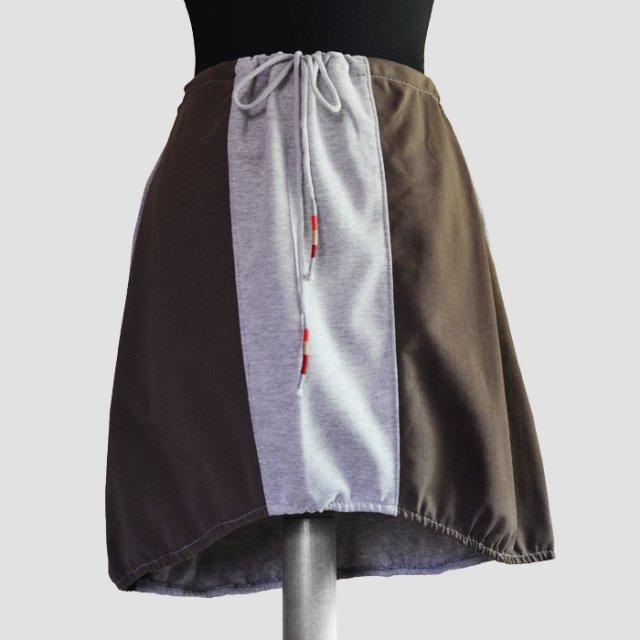 Spódniczka wykonana została z dresowej dzianiny w kolorze szarym i kawowym . Bardzo wygodna, asymetryczna, tył dłuższy od przodu. Wiązana szarym sznureczkiem w pasie, na dole ściągacz w postaci gumki. Rozmiar M