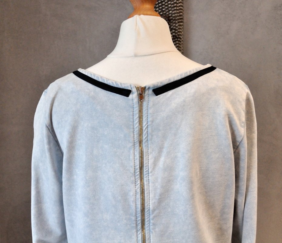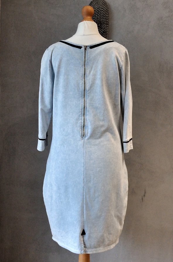 Okrągły, łódkowaty dekolt. Rękawy do łokci. Na biodrach kieszenie. Na plecach długi, ozdobny zamek w kolorze starego złota. Z tyłu rozporek - wzmocniony trójkątem z czarnego materiału.