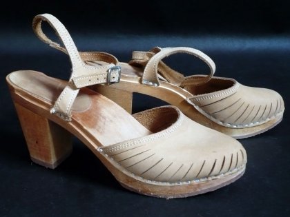 Oryginalne buty - drewniaki.Wykonane z drewna i naturalnej, grubej skóry. Zapinane wokół kostek.Podeszwa z gumą.