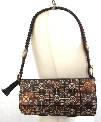 Mała torebka ,łączone nitką drewniane kwadraty z wyżłobionym wzorem.Podszewka brązowa.Góra zapinana na zamek.Pasek pleciony ze sznurka z muszelkami..Stan bardzo dobry.Wysokość 13 cm.szerokość 21,5 cm.pasek dł.58 cm.