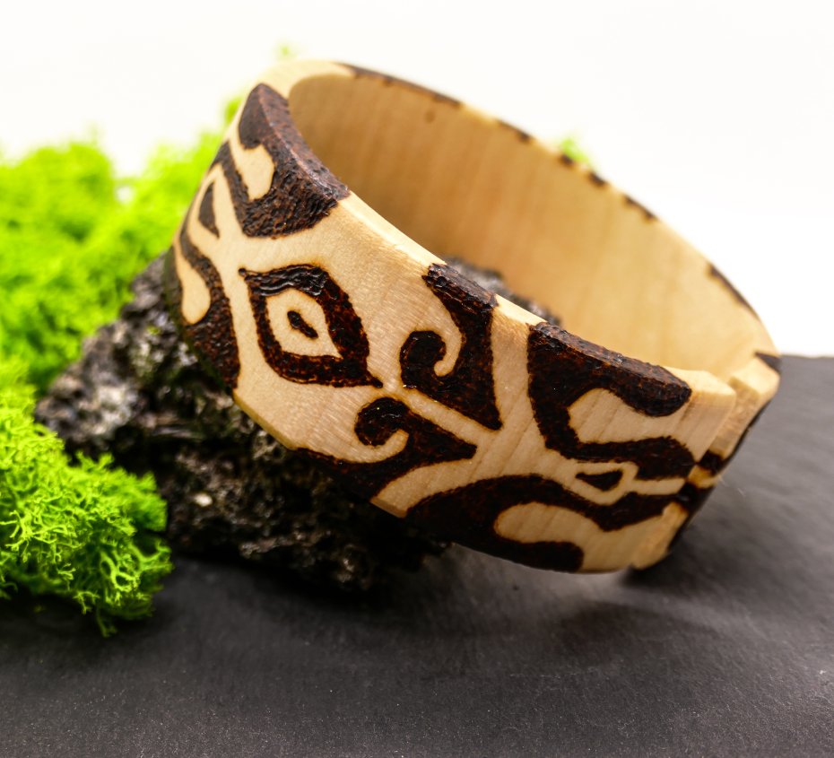 Bransoletka wykonana z drewna bukowego, ręcznie zdobiona metodą pirografii. Otwarty fason (średnica 6-7 cm) pozwala na dopasowanie do nadgarstka, a zabezpieczenie wysokiej jakości olejem zapewnia trwałość i podkreśla naturalną strukturę drewna.