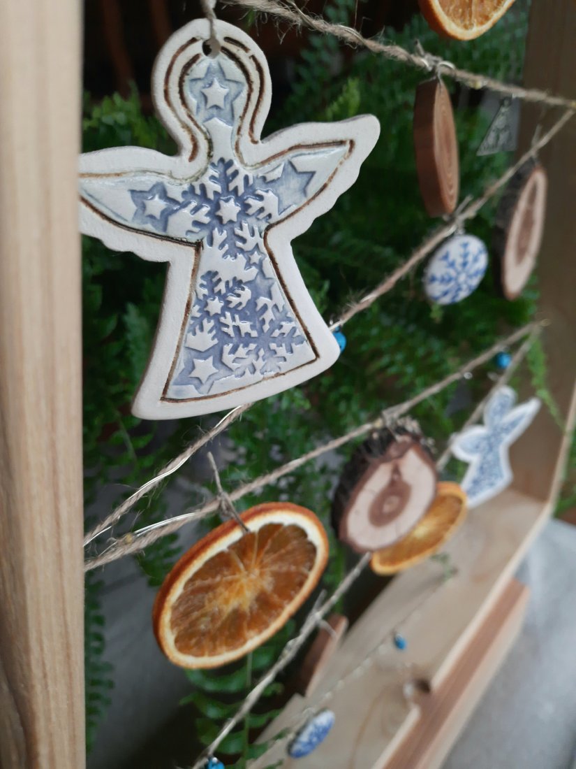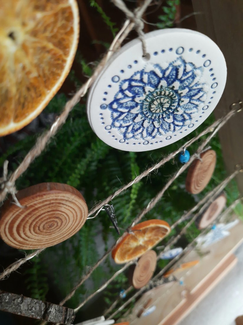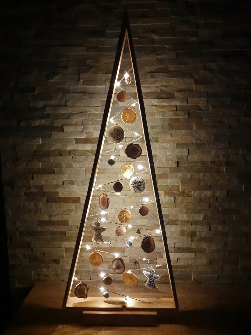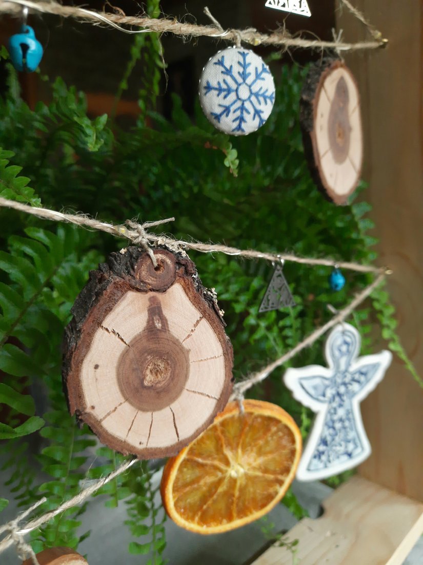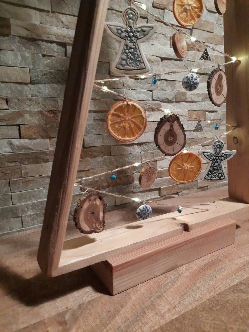 Drewniana choinka z ręcznie haftowanymi bombkami, ceramicznymi przywieszkami, suszonymi pomarańczami, drewnianymi plasterkami, metalowymi dzwonkami i światełkami. Wszystkie elementy zawieszone na lnianym sznurku.