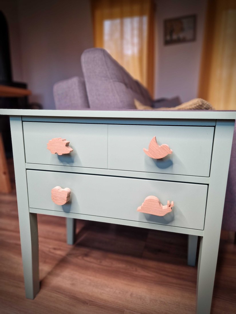 Model "Ptak" pięknie łączy się z innymi leśnymi wzorami – np. lisem, jeżem czy ślimakiem – tworząc spójną, naturalną kolekcję meblowych uchwytów.