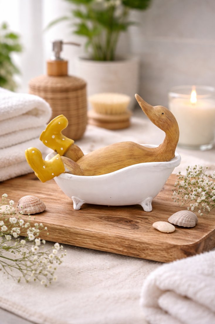 Wyjątkowa, drewniana figurka kaczki przedstawiona w zabawnej, relaksującej pozie – wygodnie leży w małej wannie na nóżkach. Naturalna struktura drewna pięknie podkreśla rękodzielniczy charakter dekoracji, a żółte kalosze w białe kropeczki dodają jej humoru i lekkości.