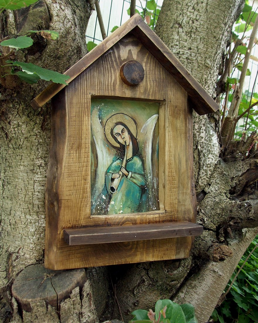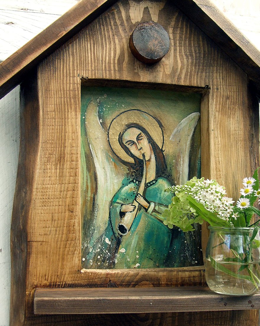 Tagi: #drewniana kapliczka, #kapliczka z aniołem, #malowane na drewnie, #obrazek z aniołem