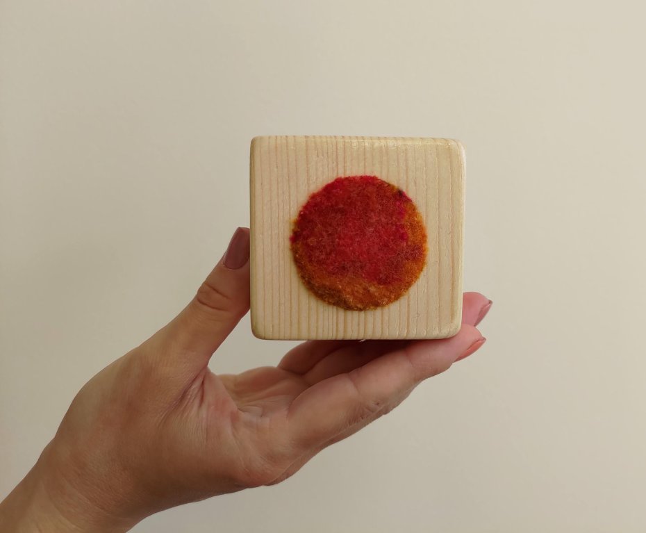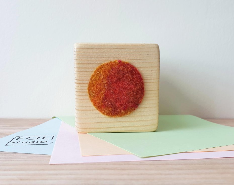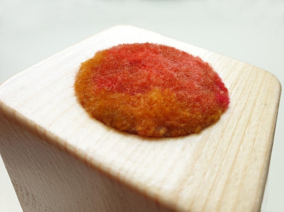 Kontrast faktur – twardego drewna i miękkiej włóczki – sprawia, że ta mała ozdoba wyróżnia się w tłumie dodatków. Przyciąga uwagę, zapada w pamięć i... wywołuje uśmiech.