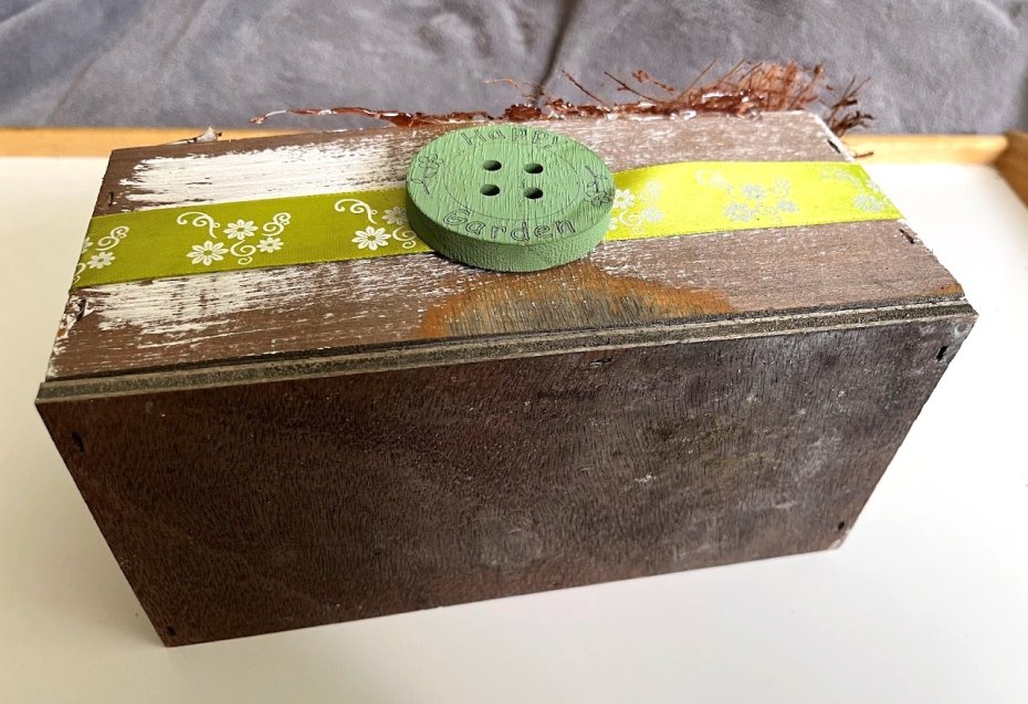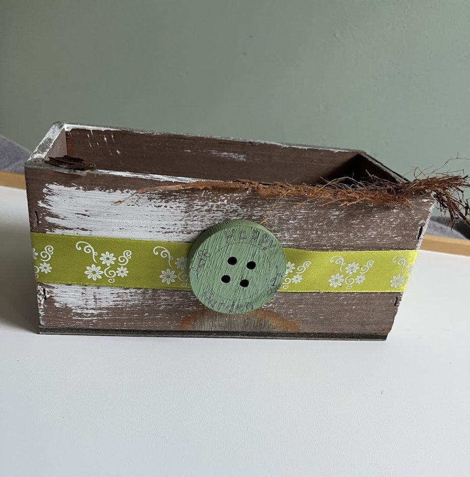Drewniana skrzynka w stylu rustykalnym, ozdobiona zieloną wstążką w kwiatowy wzór oraz dużym drewnianym guzikiem z napisem Happy Garden. Postarzane wykończenie z przetarciami w bieli dodaje jej charakteru shabby chic.