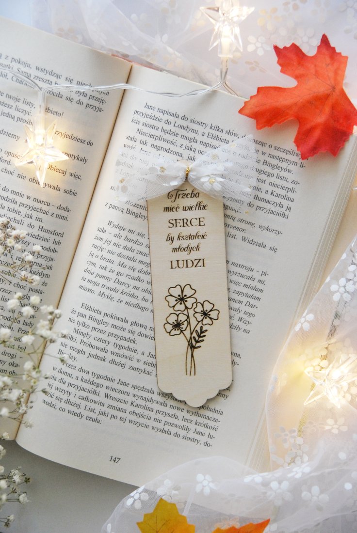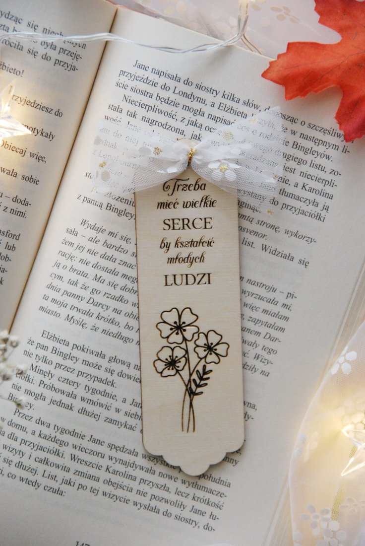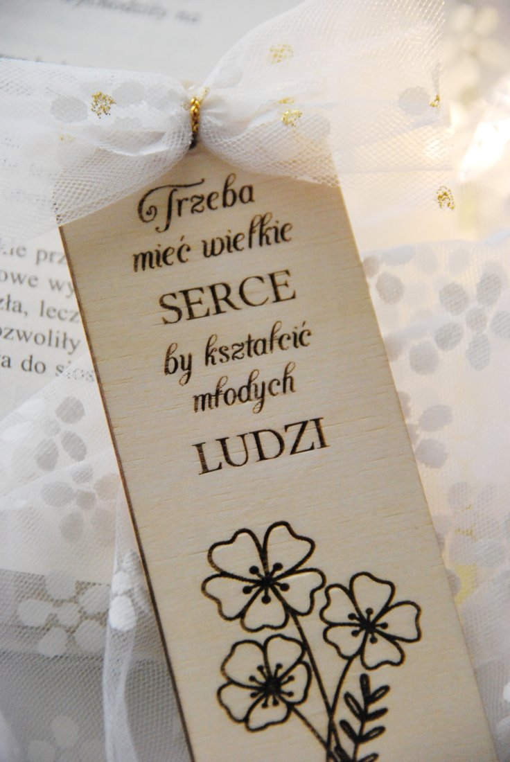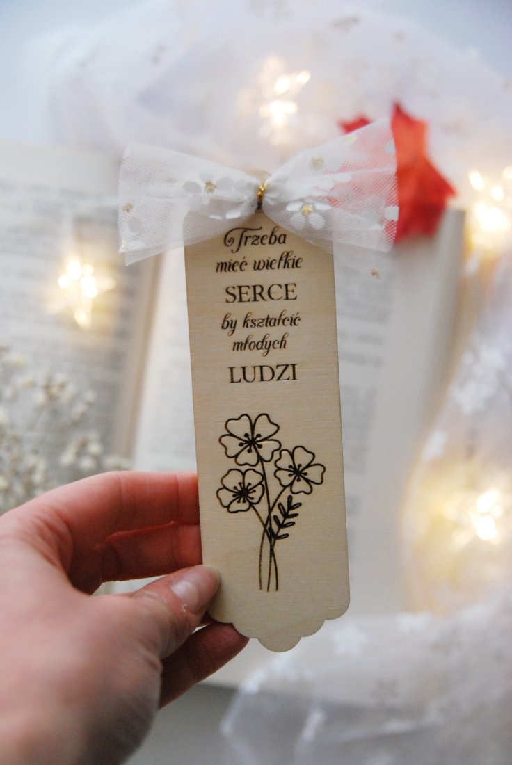 Wyjątkowa zakładka, która sprawdzi się na Dzień Nauczyciela. Wykonana z drewna, z wygrawerowanym pięknym cytatem. Dodatkowo zakładka ozdobiona jest kokardką z uroczego tiulu w kwiatuszki.