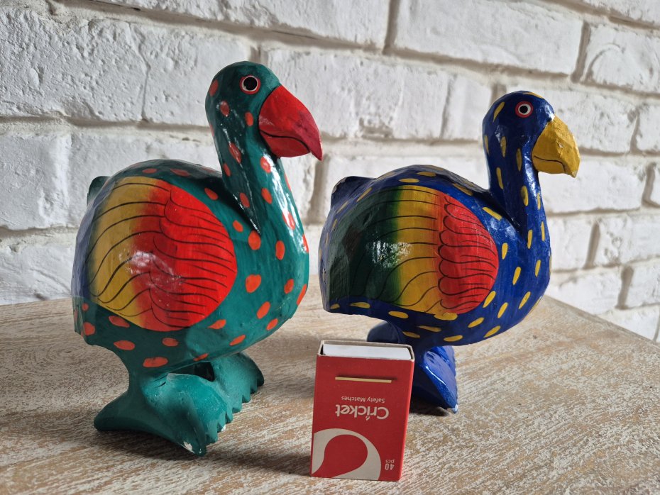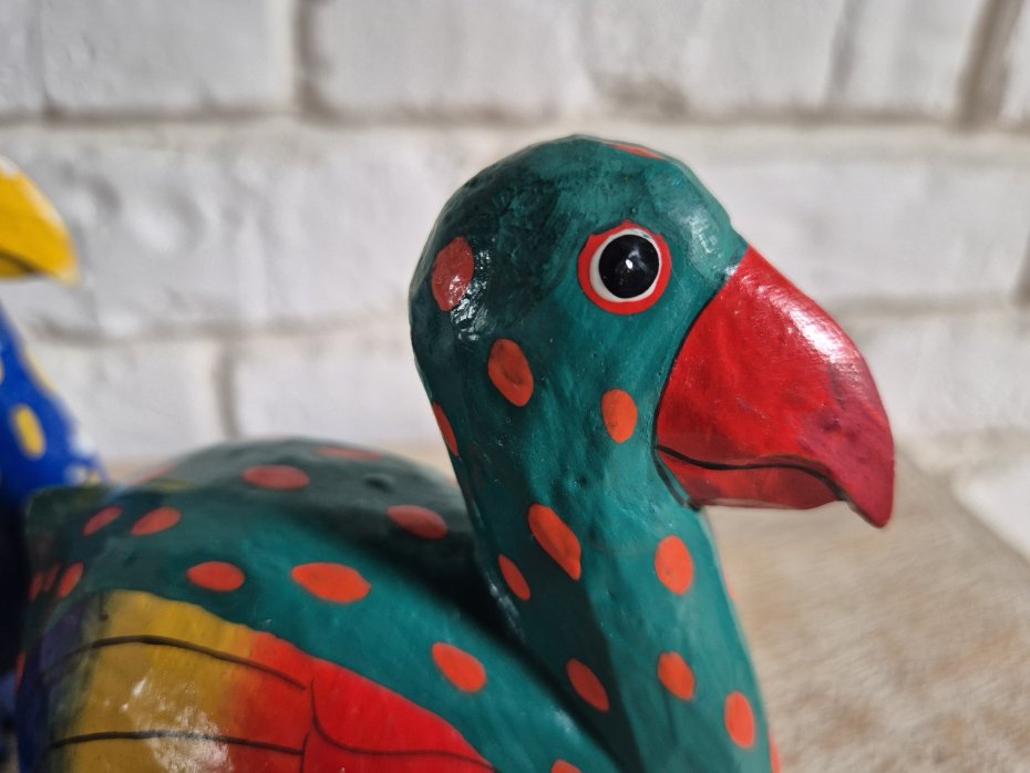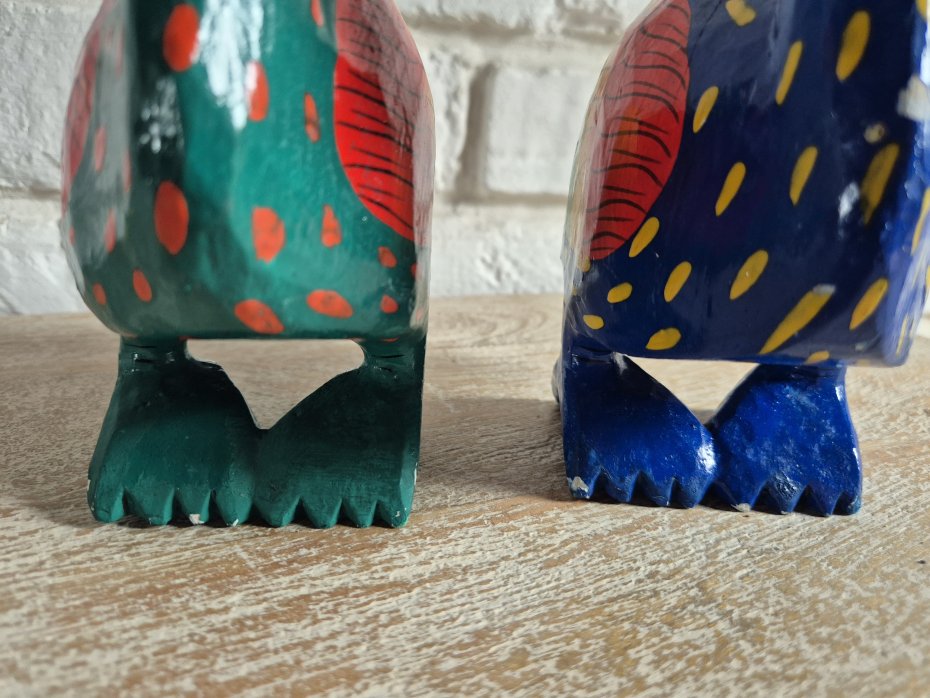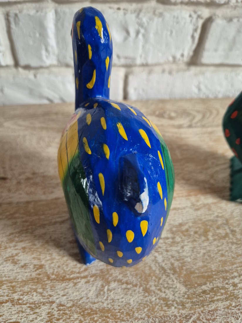 para niedużych uroczych niesamowicie kolorowych drewnianych figurek egzotycznych ptaków, prawdopodobnie wykonanych dawno temu, jeden z ptaków z przewagą koloru niebieskiego a drugi koloru zielonego, lakierowane, lekkie, handmade