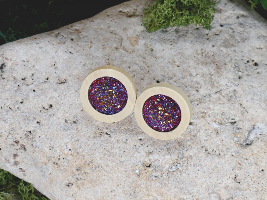 Ręcznie wykonane kolczyki z drewna w kolorze naturalnym ozdobione druzami. Idealne do letnich kolorowych stylizacji boho / hippie.
