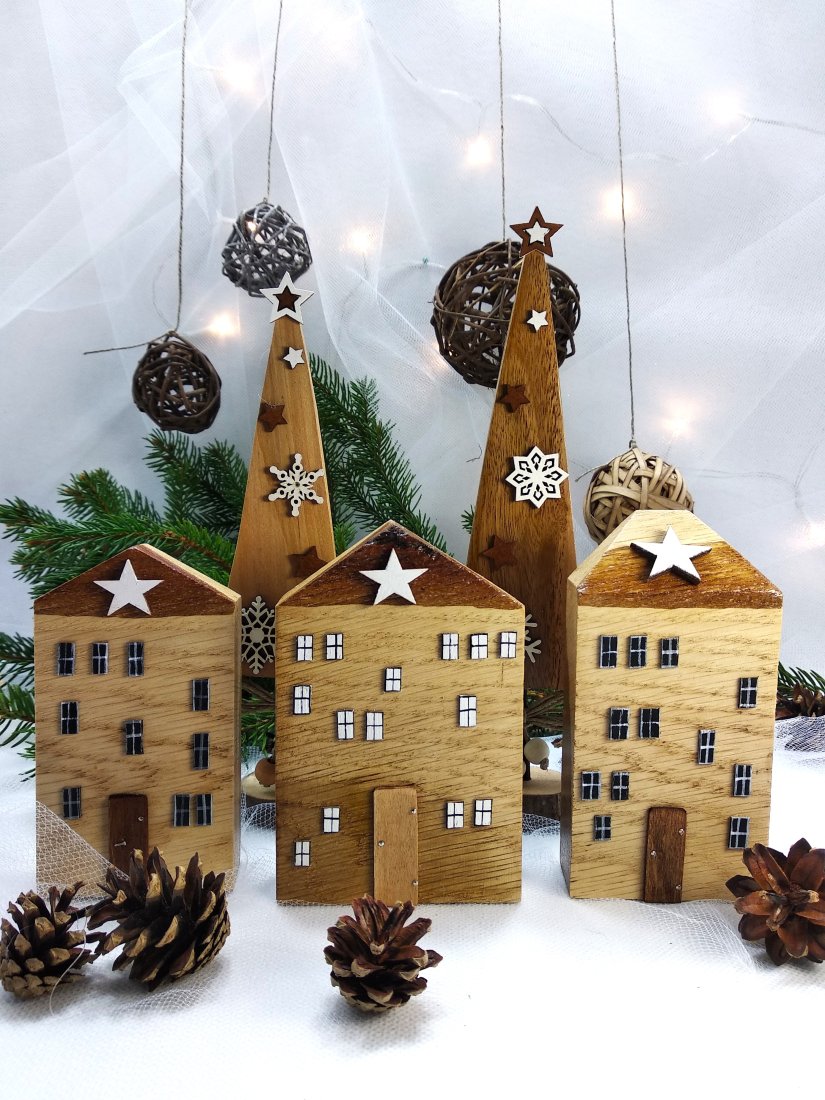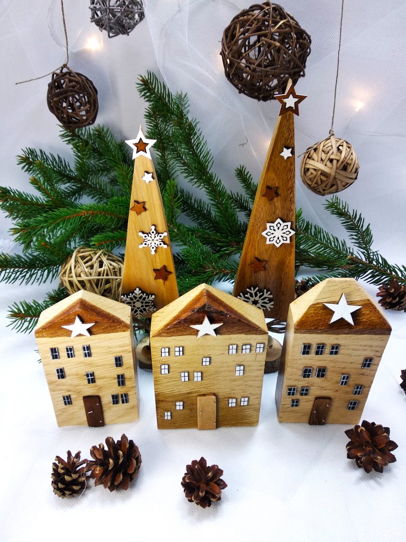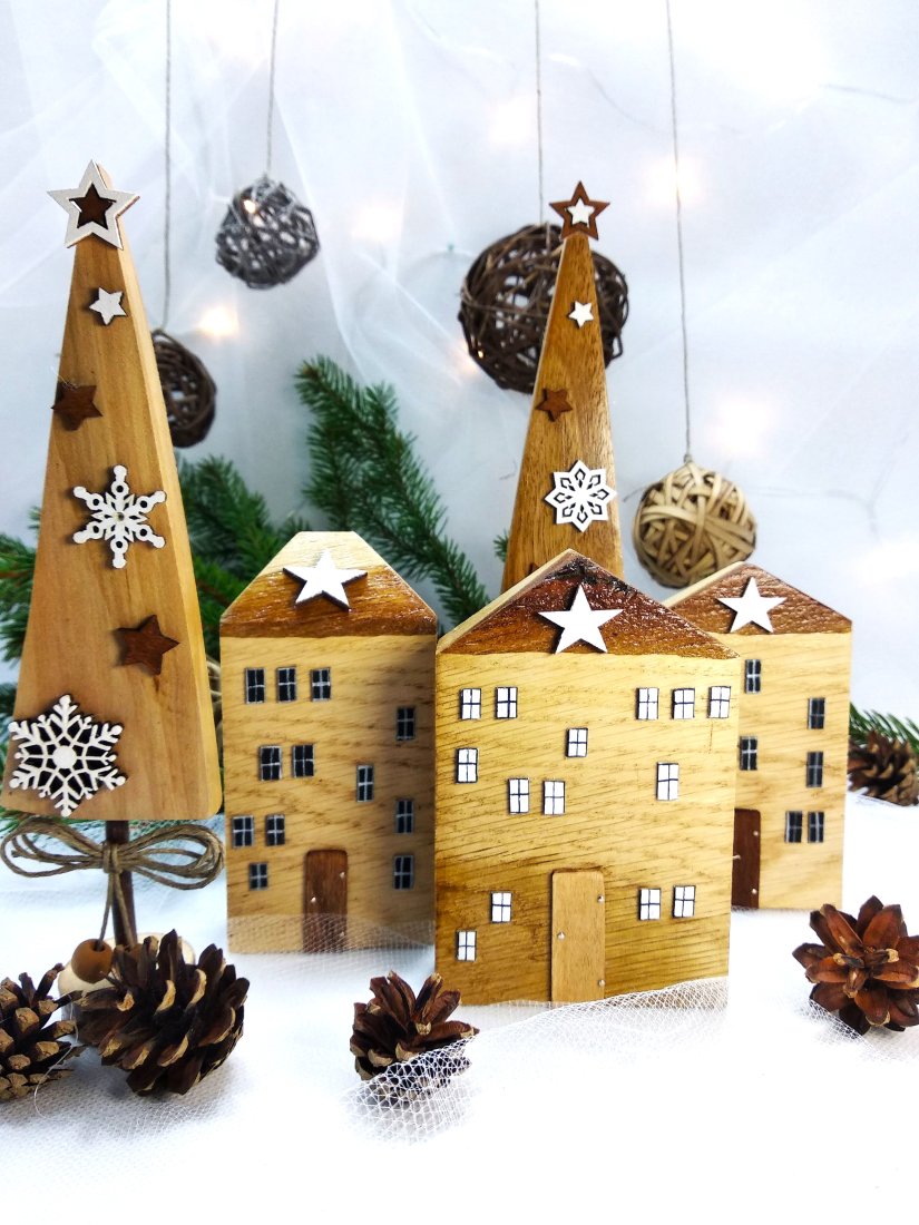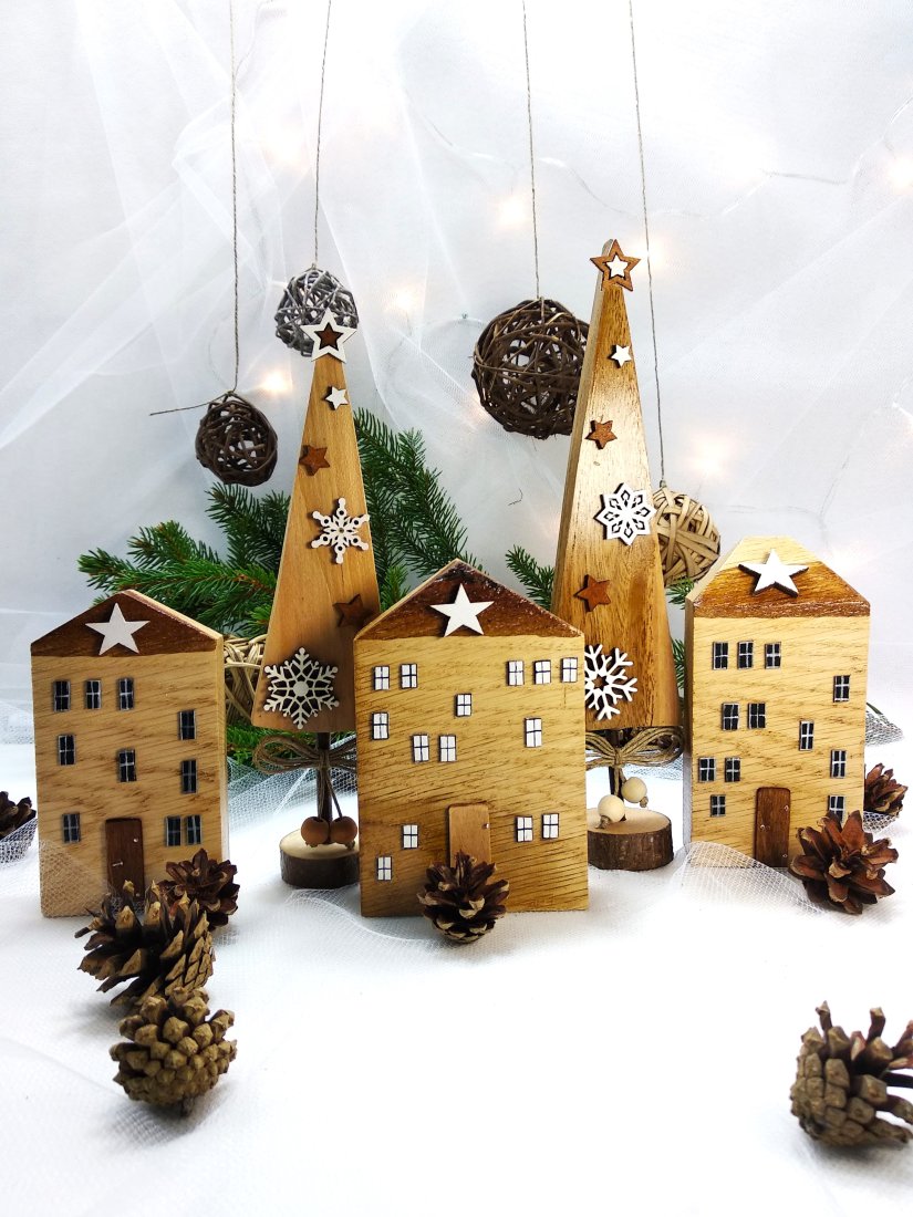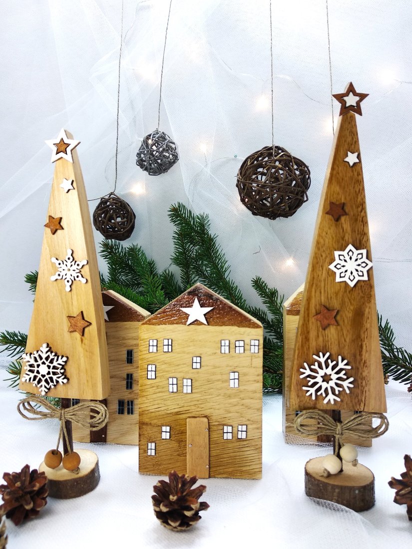Polecam zestaw trzech domków i dwóch choinek wykonanych z naturalnego drewna. Dzięki minimalistycznemu designowi będą pasować do każdego wnętrza.