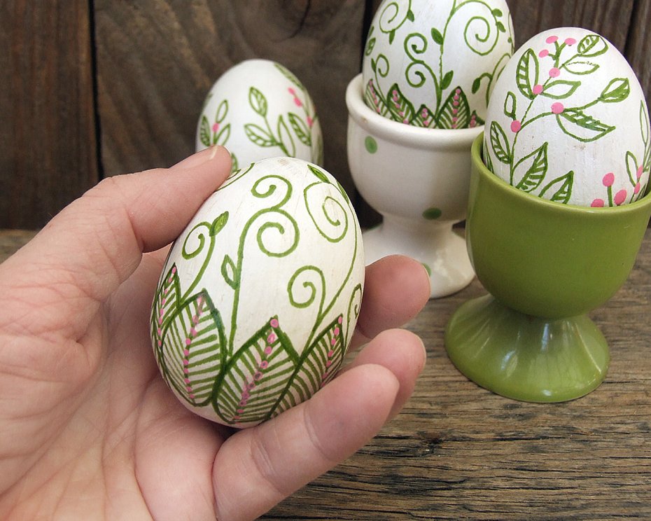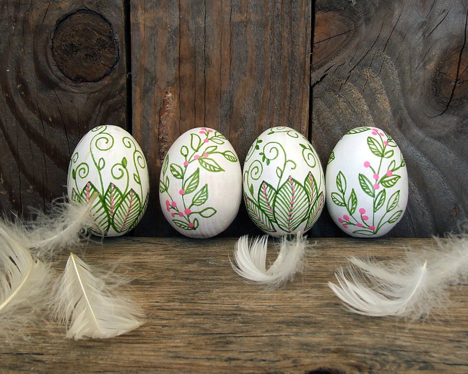 Drewniane pisanki ręcznie malowane - 4 sztuki wykonane z drewna bukowego, wielkości kurzego jajka.