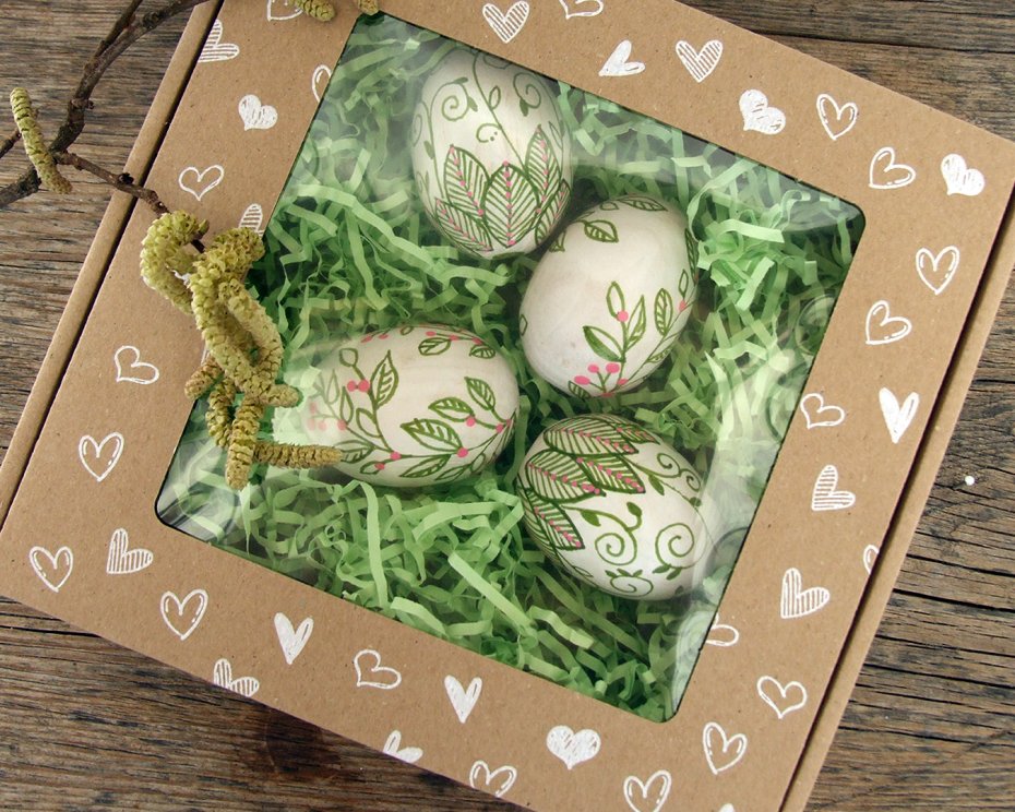 Pisanki są pakowane w kartonowe pudełko z okienkiem.