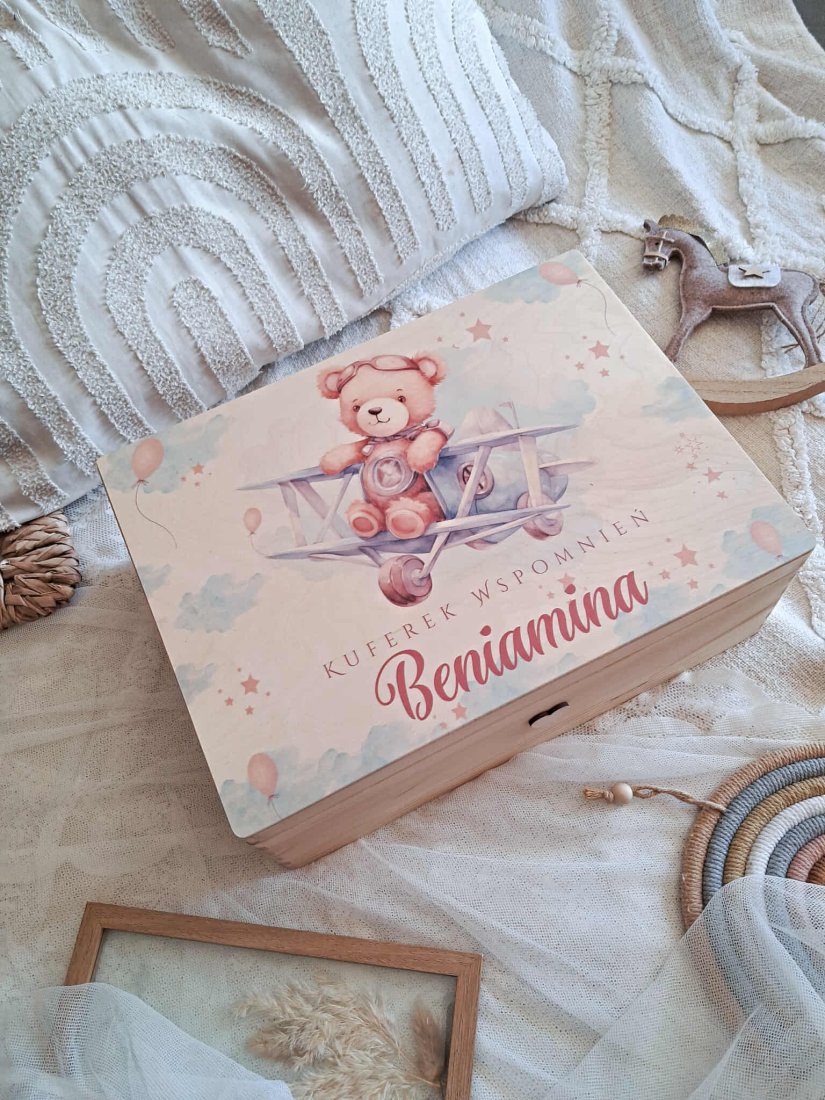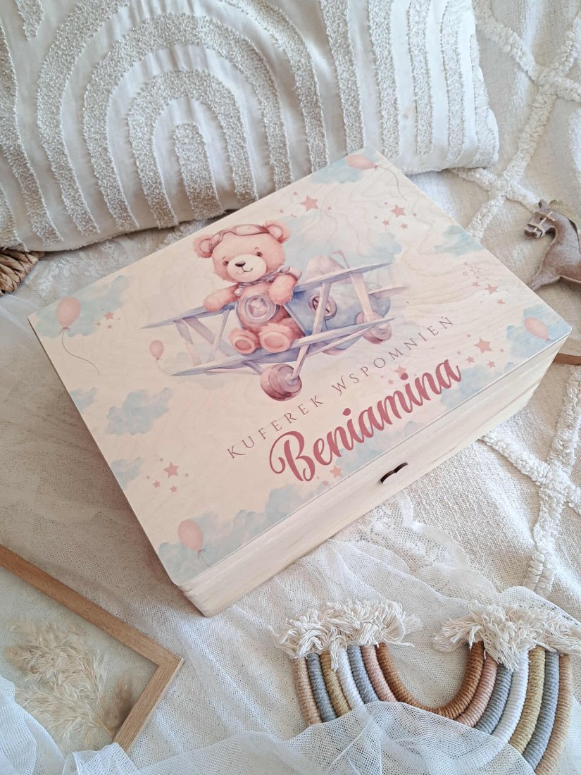 Przepiękny i wyjątkowy kuferek wspomnień z przepiękną grafiką. To idealny pomysł na pamiątkę chrztu, roczku czy urodzin. To pudełko skrzynka będzie świetnym pomysłem na prezent z okazji narodzin czy babyshower.