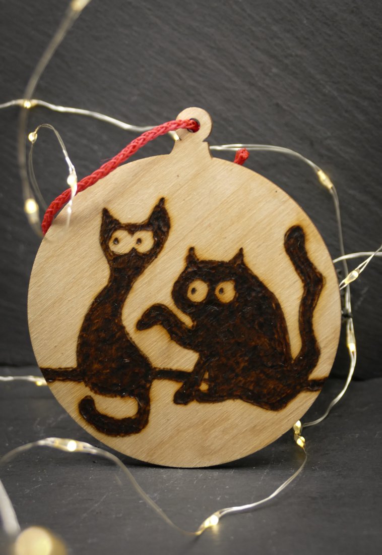 Bombka z pirografią na sklejce — zabawne wzory (skrzat / kot / renifer)
