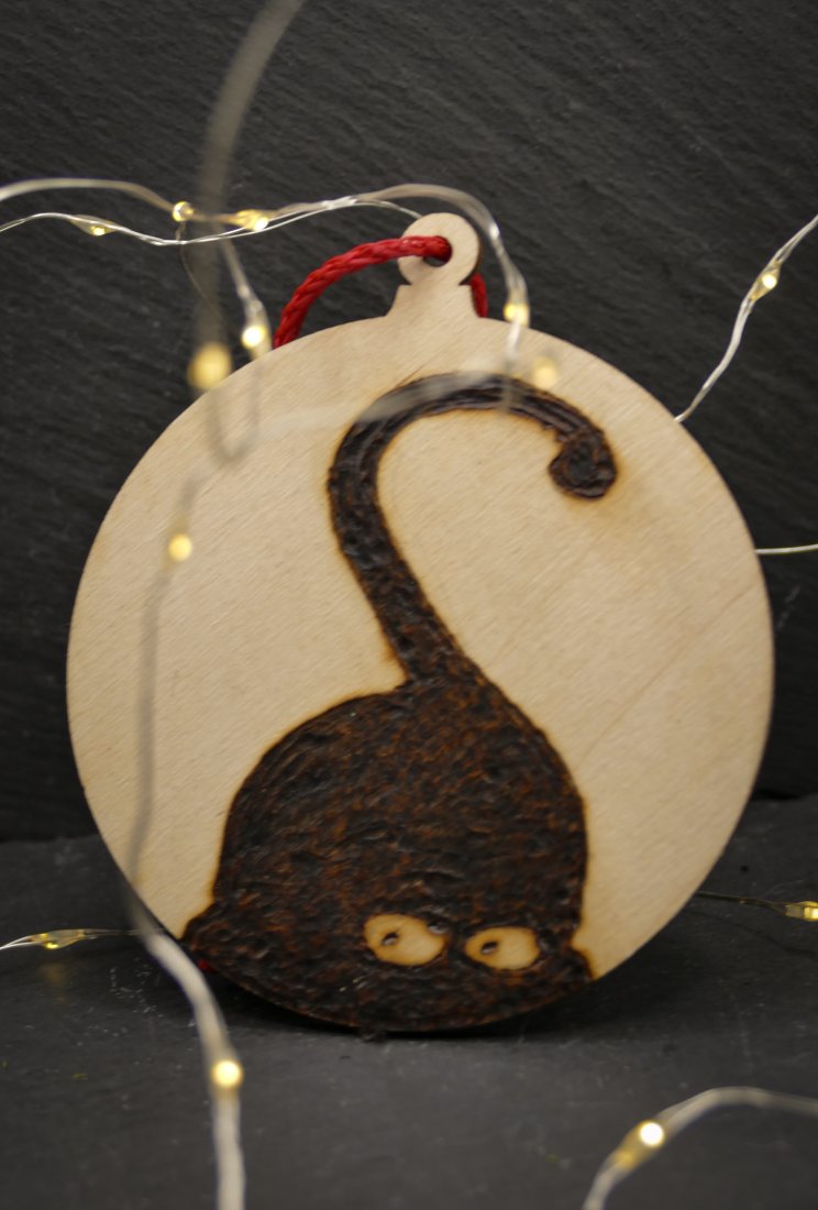 Bombka z pirografią na sklejce — zabawne wzory (skrzat / kot / renifer)