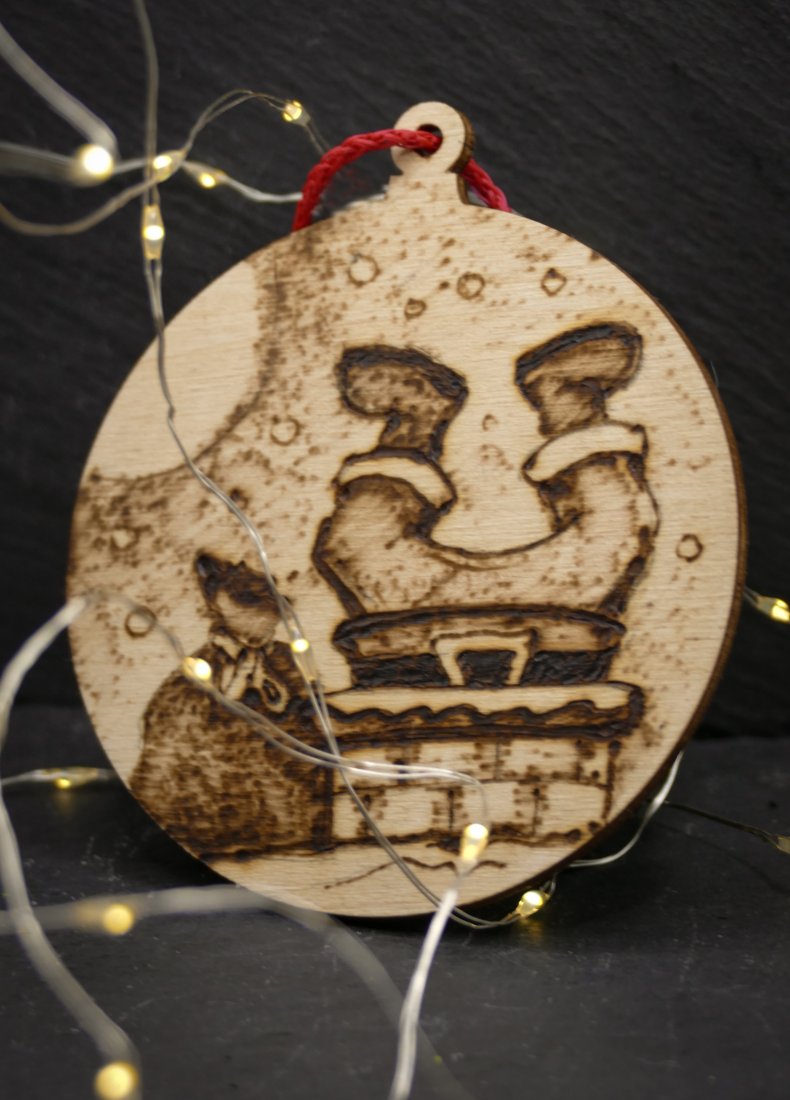 Bombka z pirografią na sklejce — zabawne wzory (skrzat / kot / renifer)