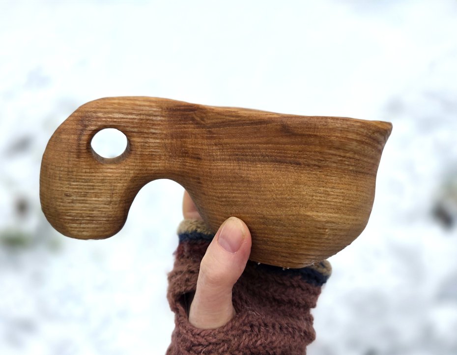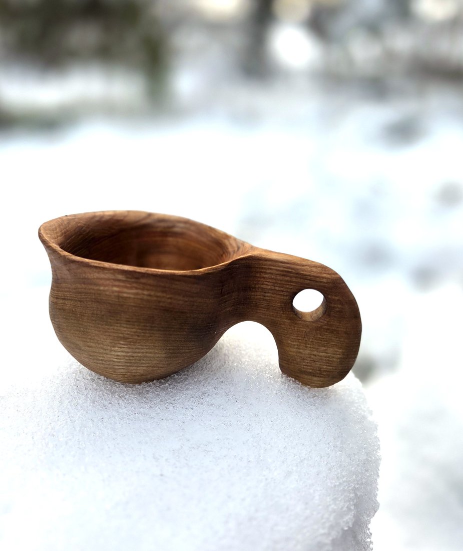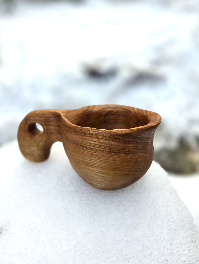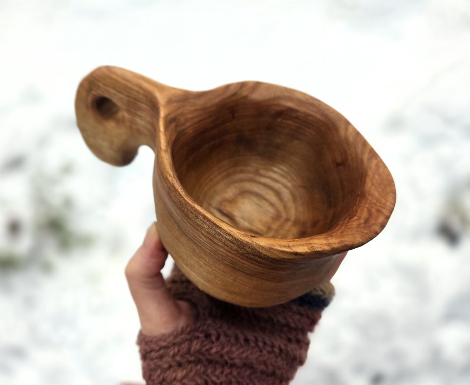 Ręcznie wykonany z drewna jesionowego, ten kubek nadaje się zarówno do napojów gorących, jak i zimnych i jest gotowy do użycia. Przydatny w kuchni, jadalni lub jako dekoracja stołu, został zakonserwowany poprzez gotowanie w mieszance wosku pszczelego i oleju lnianego. Pojemność kubka wynosi 300 ml. Kubek ma 18 cm długości z uchem, około 10 cm średnicy i 8 cm wysokości.
