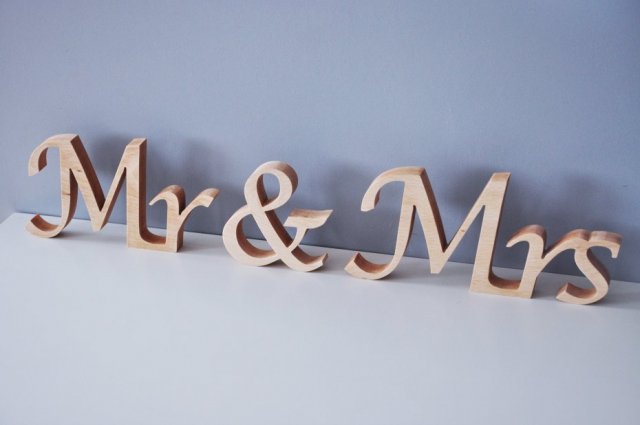 Napis Mr & Mrs wykonany z litego drewna bukowego.