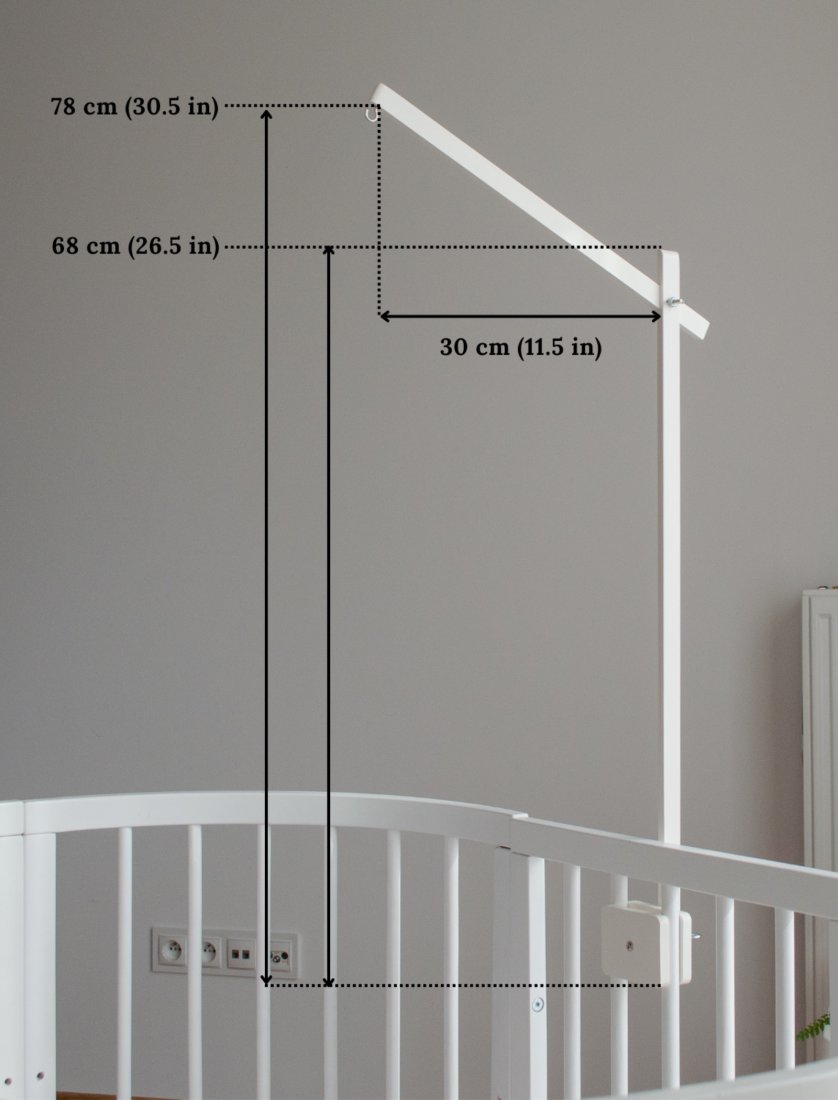 Ręcznie wykonany uchwyt z drewna sosnowego do karuzeli niemowlęcej. Stabilny montaż pod kątem 45° i wysokość 30 cm od oczu dziecka gwarantują bezpieczeństwo.