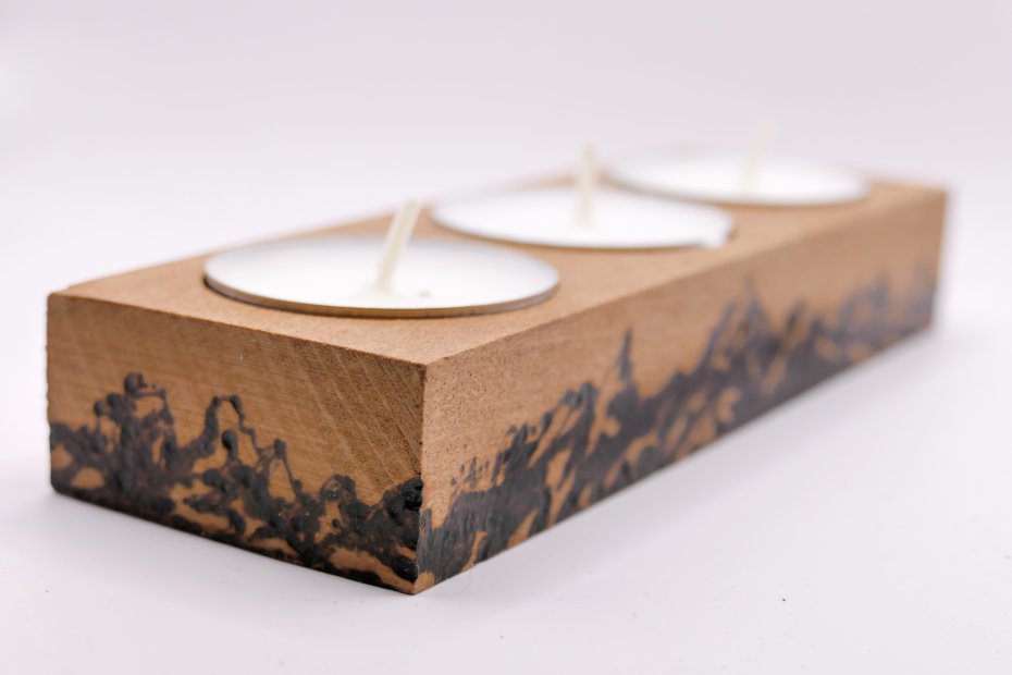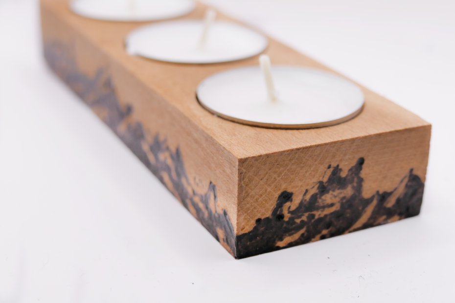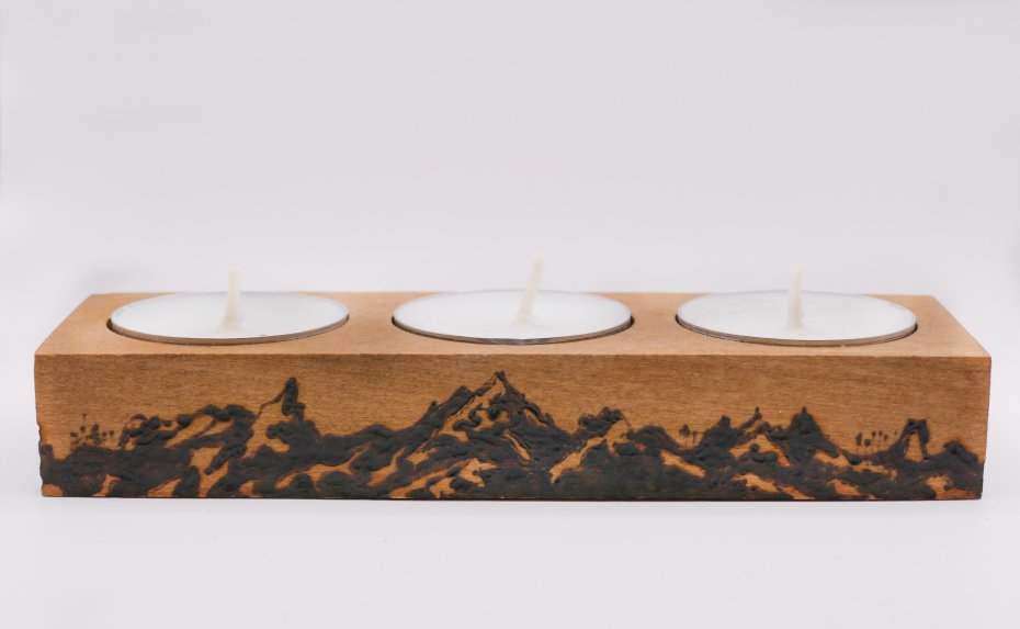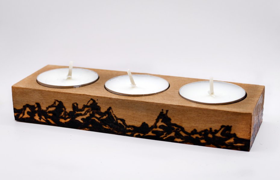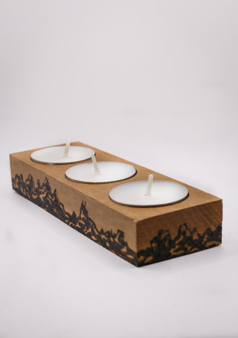 Drewniany świecznik na 3 tealighty – ręcznie wypalany wzór gór