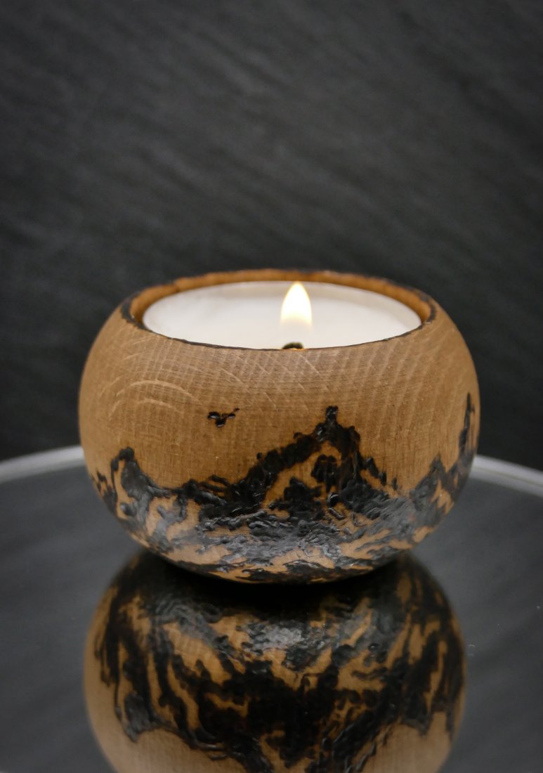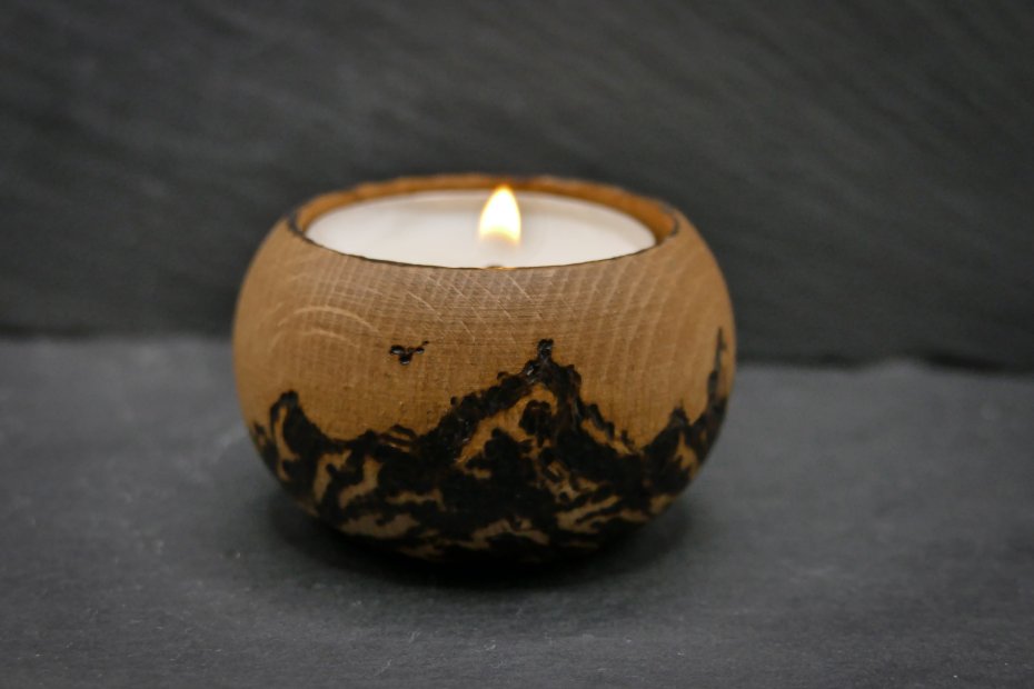 Wykonany z bukowego drewna, bejcowany na ciepły odcień jasnego dębu i zabezpieczony matowym lakierem, zachwyca subtelną dekoracją w postaci ręcznie wypalanej panoramy gór. Każdy egzemplarz jest unikalny, a starannie dopracowane detale sprawiają, że świecznik wprowadzi do Twojego domu przytulną atmosferę.