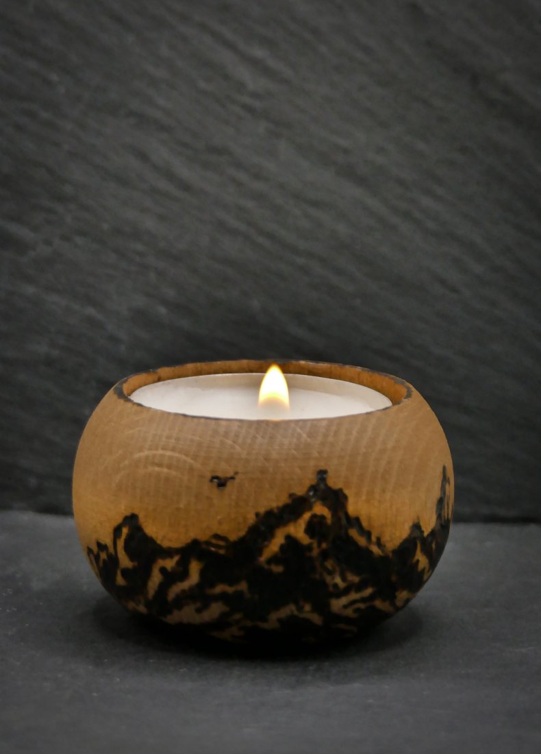 Ręcznie wykonany świecznik z górskim wzorem – drewno, pirografia