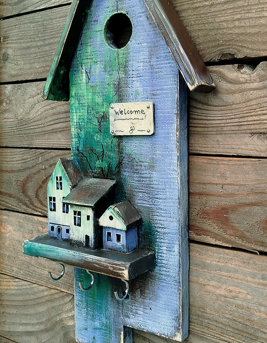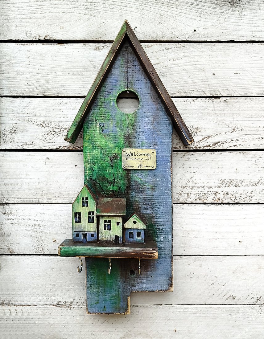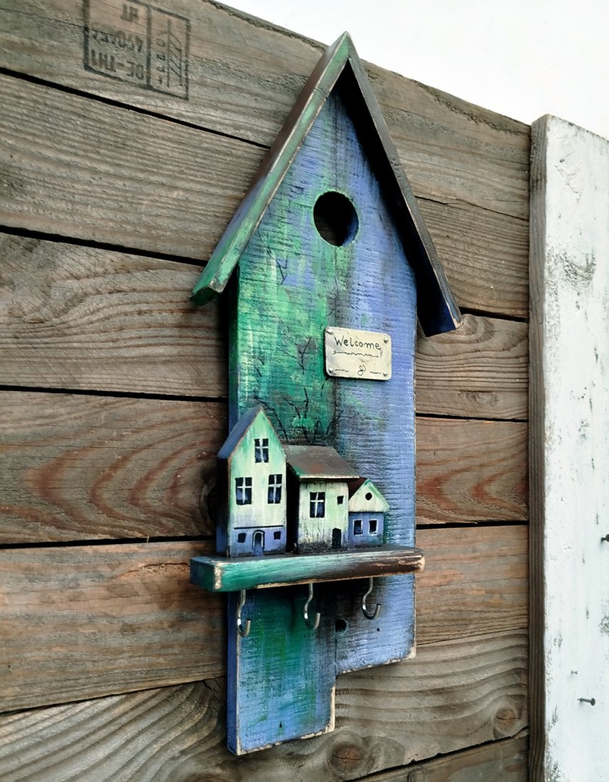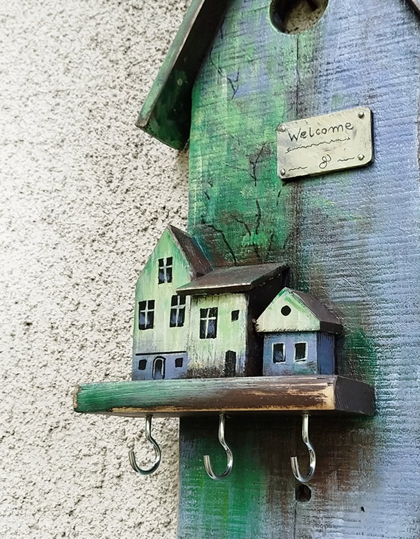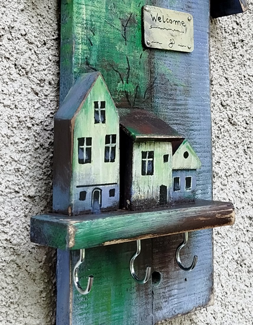 Wieszaczek, organizer na klucze. Podstawą są dwie sklejone deski, na których zamontowana jest mała półeczka z dekoracyjnymi domkami, i zamontowanymi pod spodem haczykami. Wieszak malowany jest farbami akrylowymi, zabezpieczony lakierem akrylowym. Drewno z odzysku ma ślady wcześniejszego użytkowania (otworki po gwoździach, drobne pęknięcia, przetarcia).