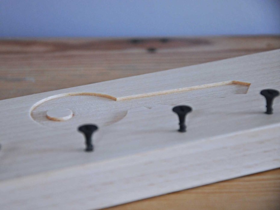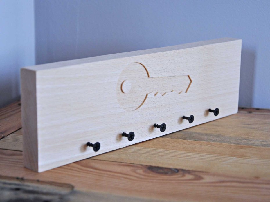 Wieszak na klucze z wygrawerowanym wzorem w formie klucza. Dostępny w wersji naturalnie pięknej. Wkręty zamiast tradycyjnych haczyków nadają nieco industrialnego klimatu temu delikatnemu i uroczemu drewnianemu dodatkowi w naszym mieszkaniu.