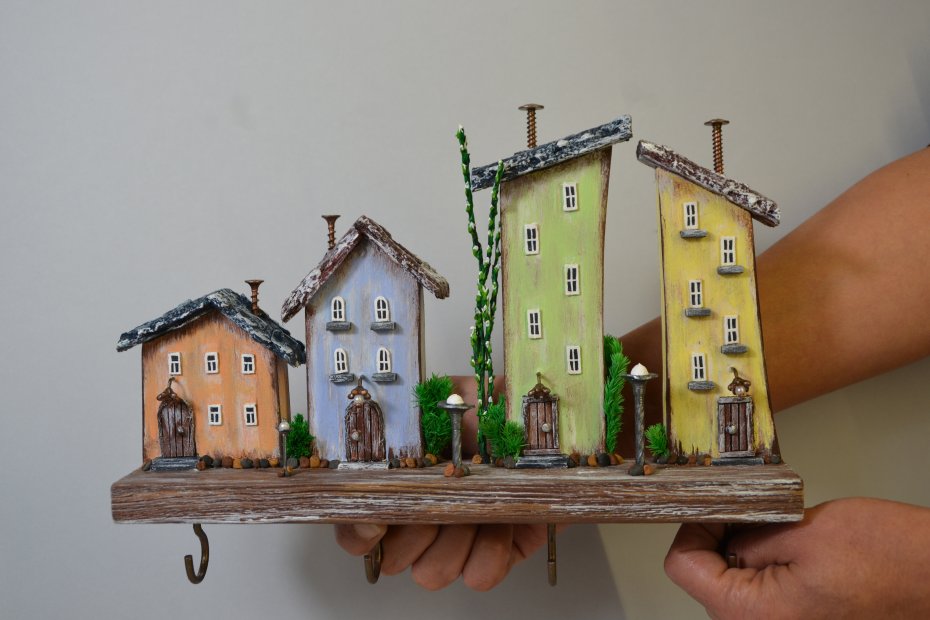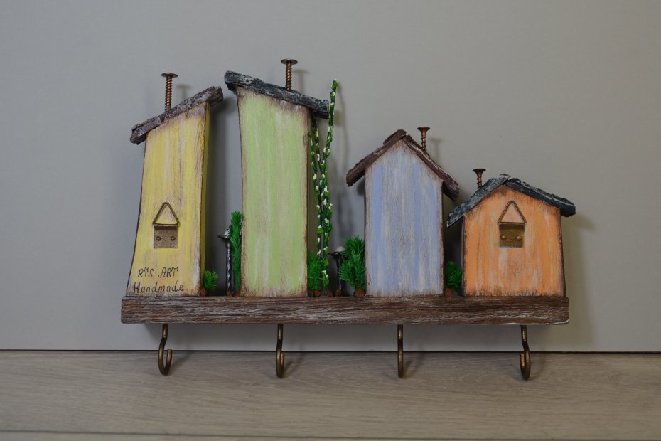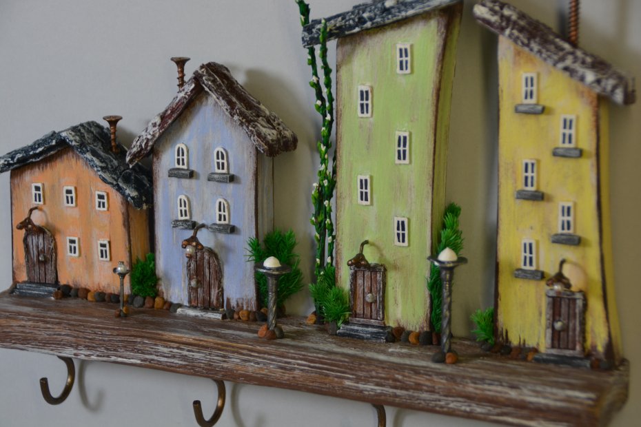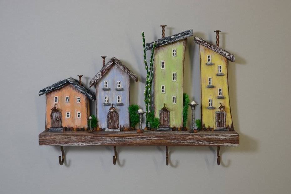 Tagi: #dekoracja scienna, #drewniany wieszak, #kolorowe domki, #ozdoba do przedpokoju