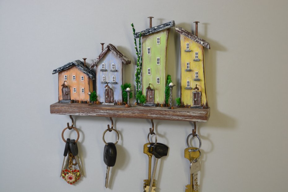 Uroczy, ręcznie wykonany drewniany wieszak na klucze w formie kolorowych domków. Każdy domek został starannie wyrzeźbiony i pomalowany, dzięki czemu całość tworzy wyjątkową dekorację ścienną w stylu rustykalnym i bajkowym.
