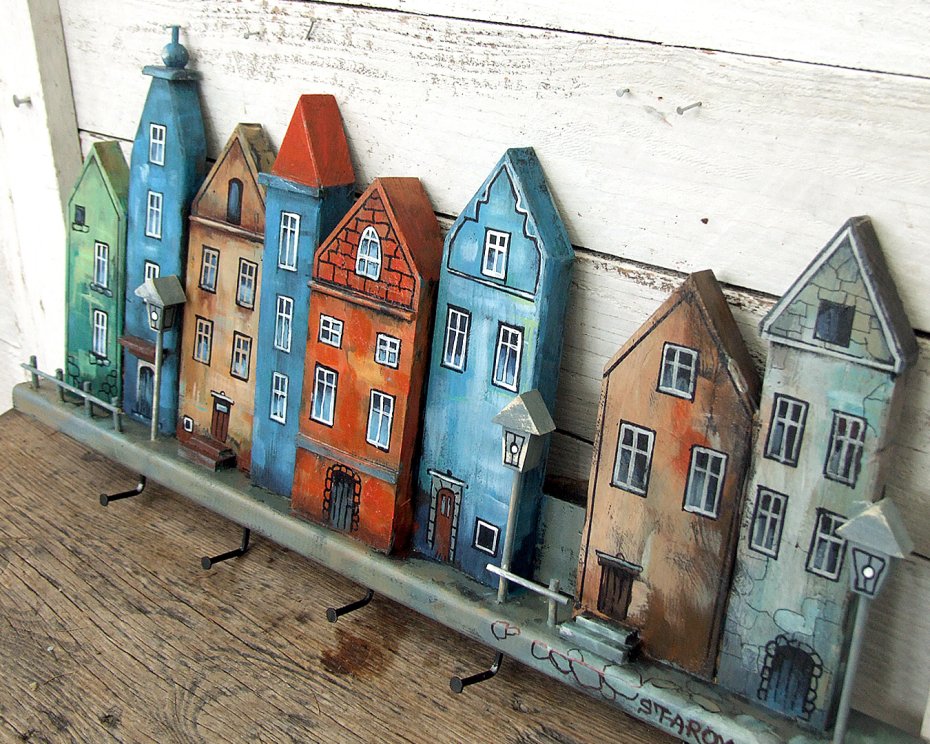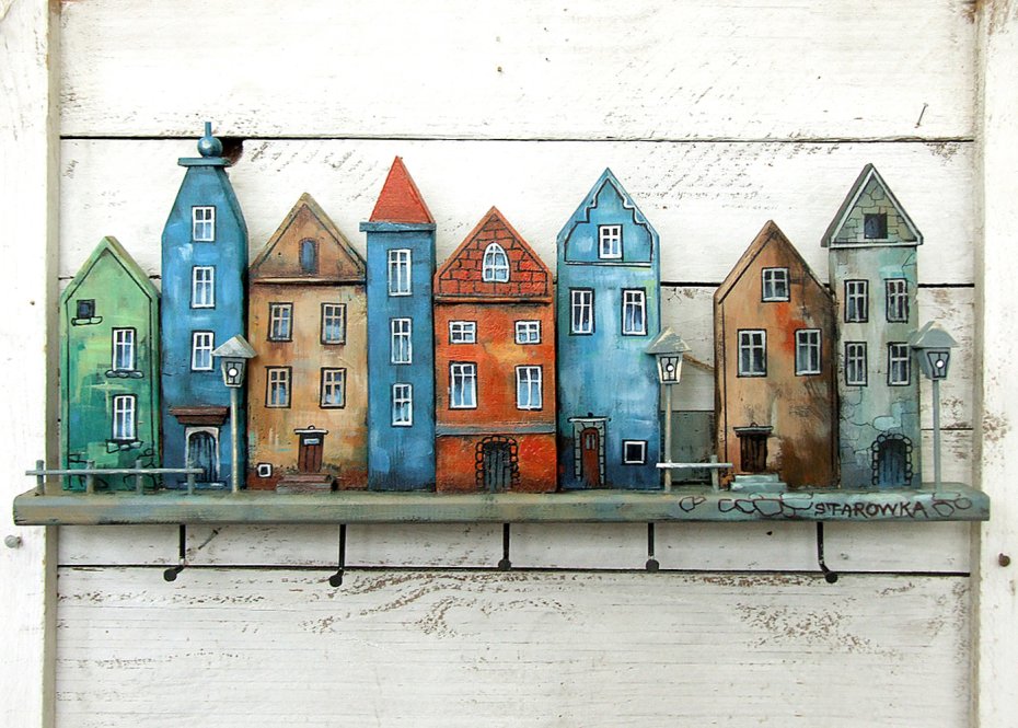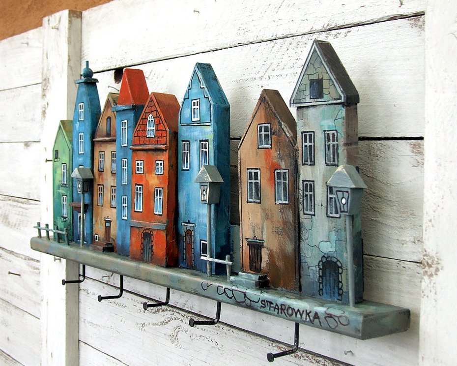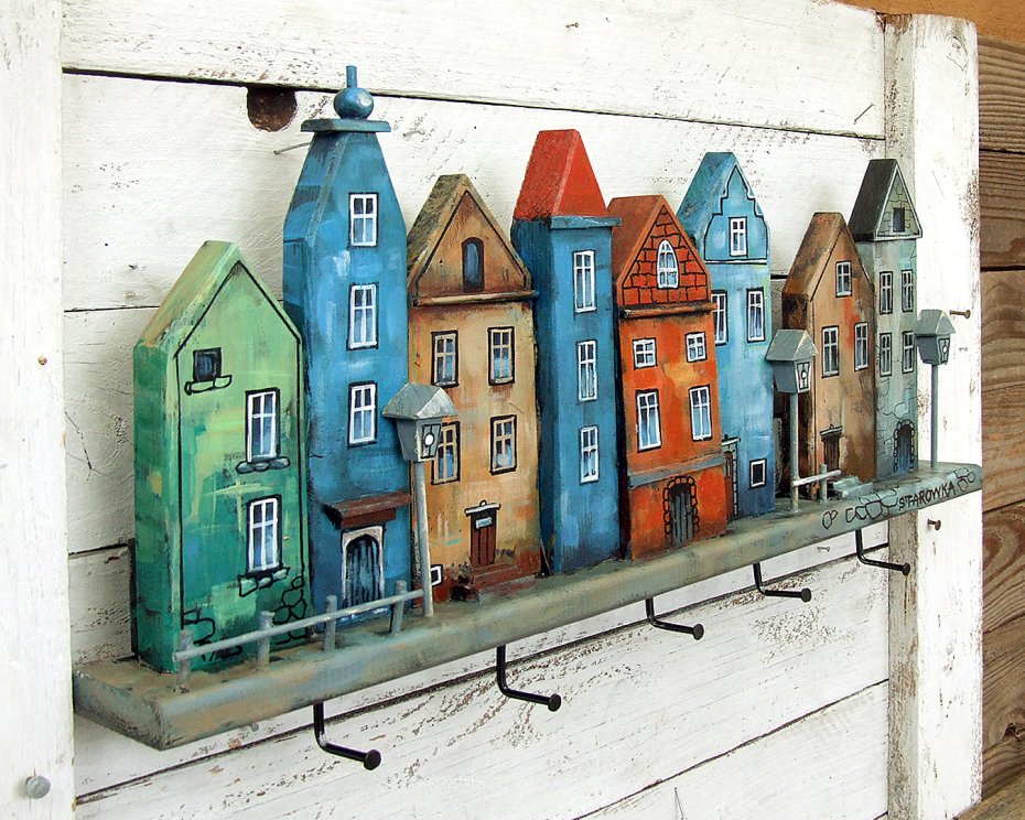 Tagi: #drewniany wieszak na ścianę, #prezent do domu, #ręcznie malowany wieszak, #wieszak z domkami