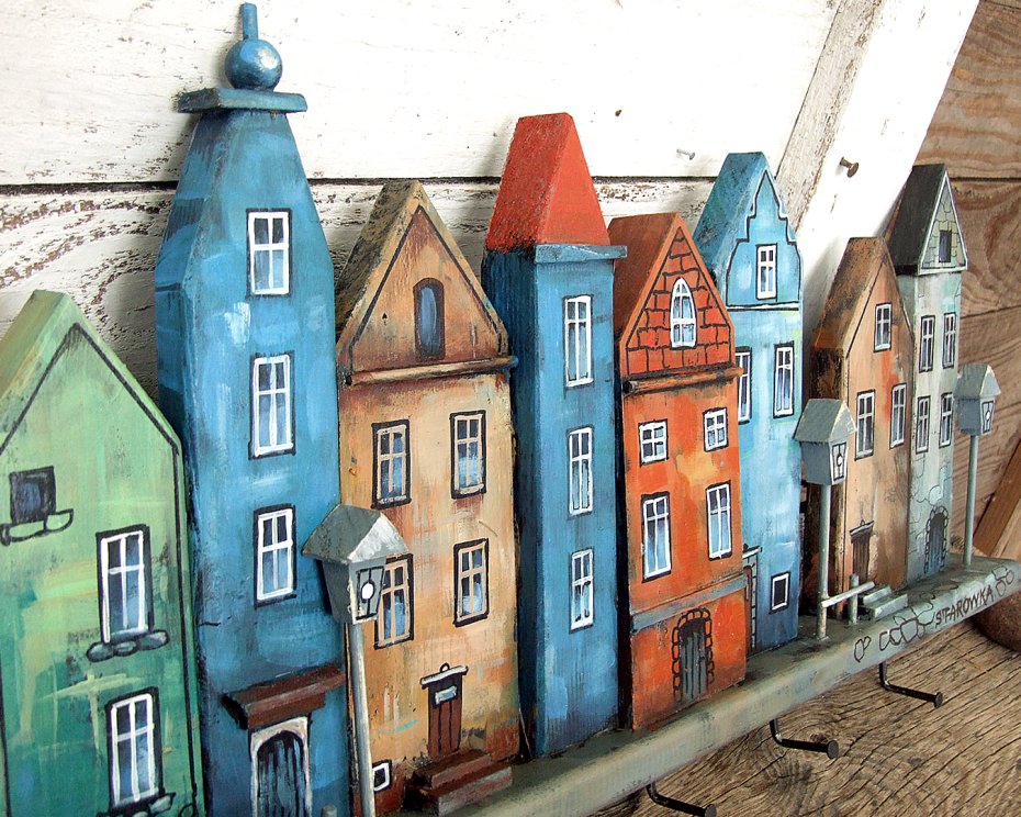 Domki mają proste kształty, całość konstrukcji nie jest więc skomplikowana, a cały efekt to bardzo dokładne i szczegółowe malowanie kamieniczek: ogromna ilość okienek, drzwi ze szczegółami, dobranie i cieniowanie koloru - to tworzy wyjątkowy klimat tej dekoracji. Całość jest zabezpieczona matowym lakierem akrylowym.
